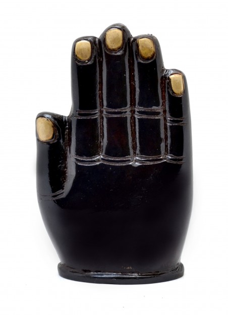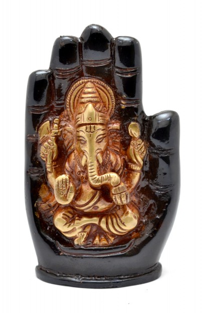Inside a palm, this idol is a Chaturbhuj Shree Ganesha - The Hindi word 'Chaturbhuj' means the one who has four hands. In this posture Lord Ganesha is depicted with his four hands. The upper right hand has a 'Pharsa' or an axe symbolizing cutting attachment bonds. The lower right hand is raised with palm facing outwards away from the body with fingers flexed. This hand gesture is called 'Abhayamudra' that offers protection for all from all evils. The upper left hand is shown holding a conch, 'Shankha' in Hindi. The sound of the conch is considered pious in Hinduism and represents the call to come and pray. The lower left hand holds a special sweet called 'Modak or Laddoo'. It is believed that it is the favorite sweet of Lord Ganesha, also it represents the sweet result of prayers one offers and the sweetest things of all - The liberation or 'Moksha'.