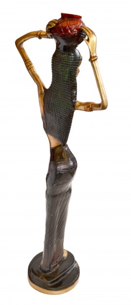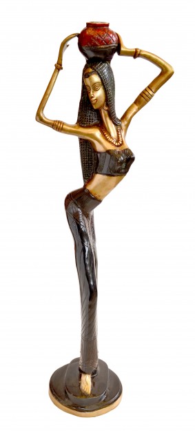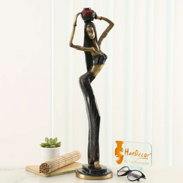 A sculpted tribute to the African woman and her struggles, this work by Two Moustaches hypnotizes with its details, emerging subtly from the golden tone of Brass. The impact of the statuette touches the heart powerfully, her frail features proudly carrying a vase on her head as she leads for her daily rituals. Her frame is only a carriage, as she resiliently performs her duties of lessening the burdens of fellow human beings. Offer sensitivity to any setting with this piece. It is unique, creative and focuses on the traditional outlook in your life. It is perfect for gifting and decoration.