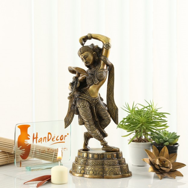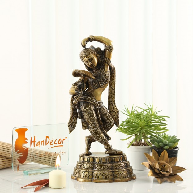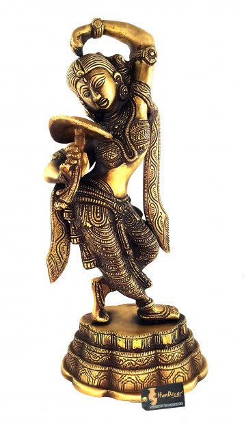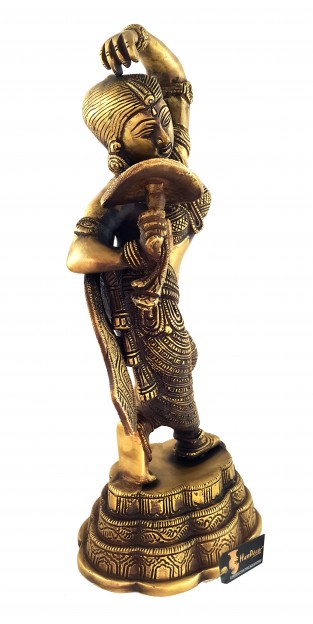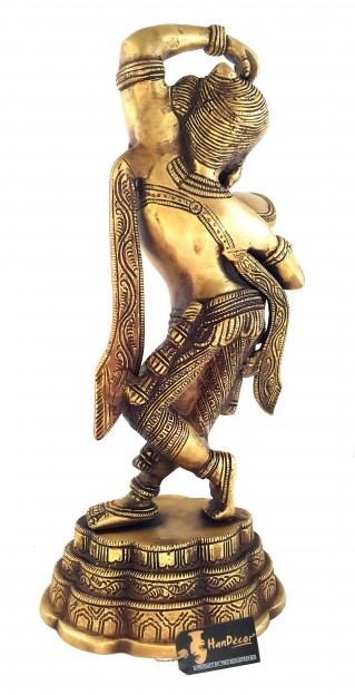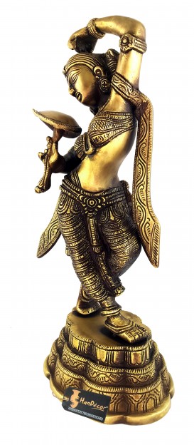 The maiden, represented in this statue, has been modeled on the line on which Khajuraho sculptor, working at its Parasanath temple, modeled his Shringar-rata nayika holding a mirror in her right hand and applying vermilion with the other. The Khajuraho maiden is possessed of the celestial charm and the transcendental beauty, as are the mythical denizens of the Indraloka. The represented figure is hence known as apsara, a superhuman maid. This brass statue, due to the greater plasticity of its medium and being a subsequent work, with other models and ideals of beauty in perception, marks a subtle improvement over its stone counterpart. It blends, in its modeling, the grace and plasticity of the worldwide known Gyaraspur Yakshi as well. Khajuraho apsara is broadly a relief, which has limited scope to depict the beauty of figure's back. This statue has greater perspective to feed the viewing eye. In its total impact, the figure of the damsel, represented by this brass piece, is endowed with greater mystic charm, mythical beauty and divine grace, such as are not the attributes of this world.