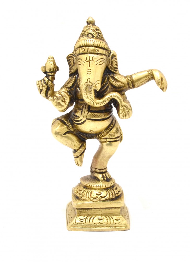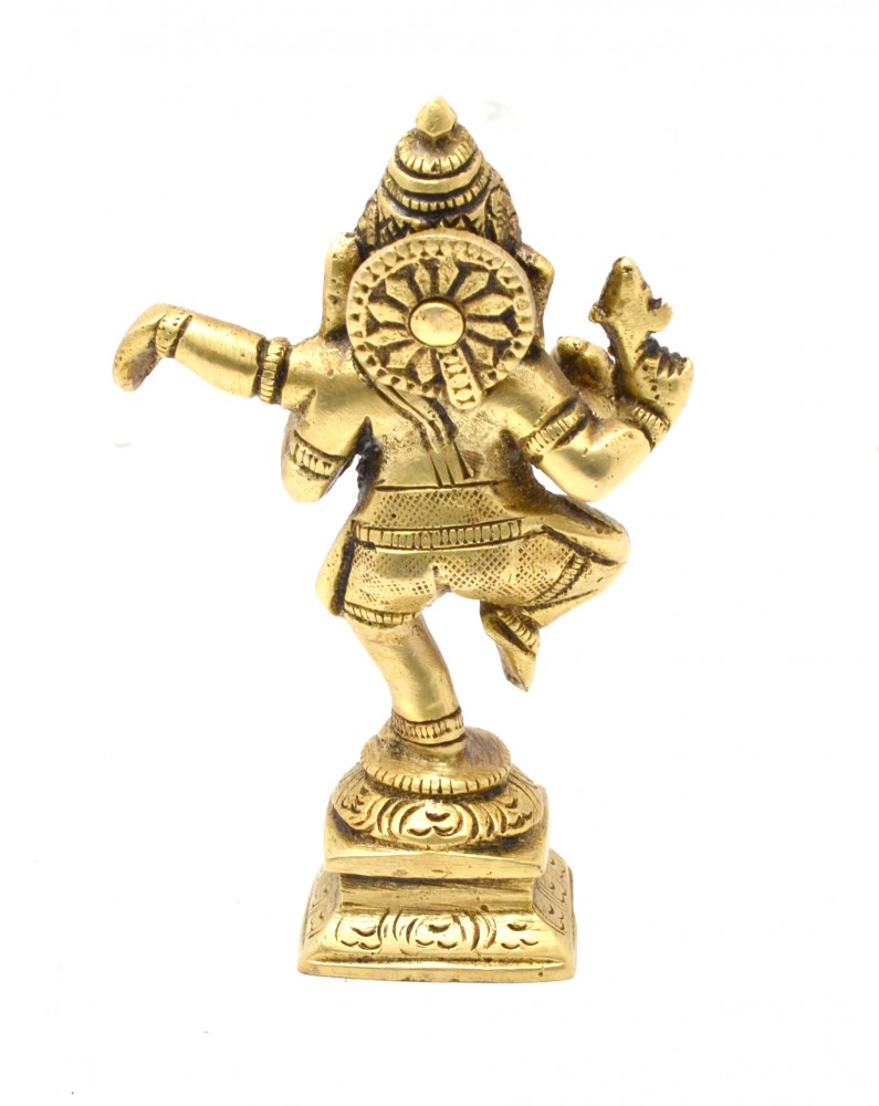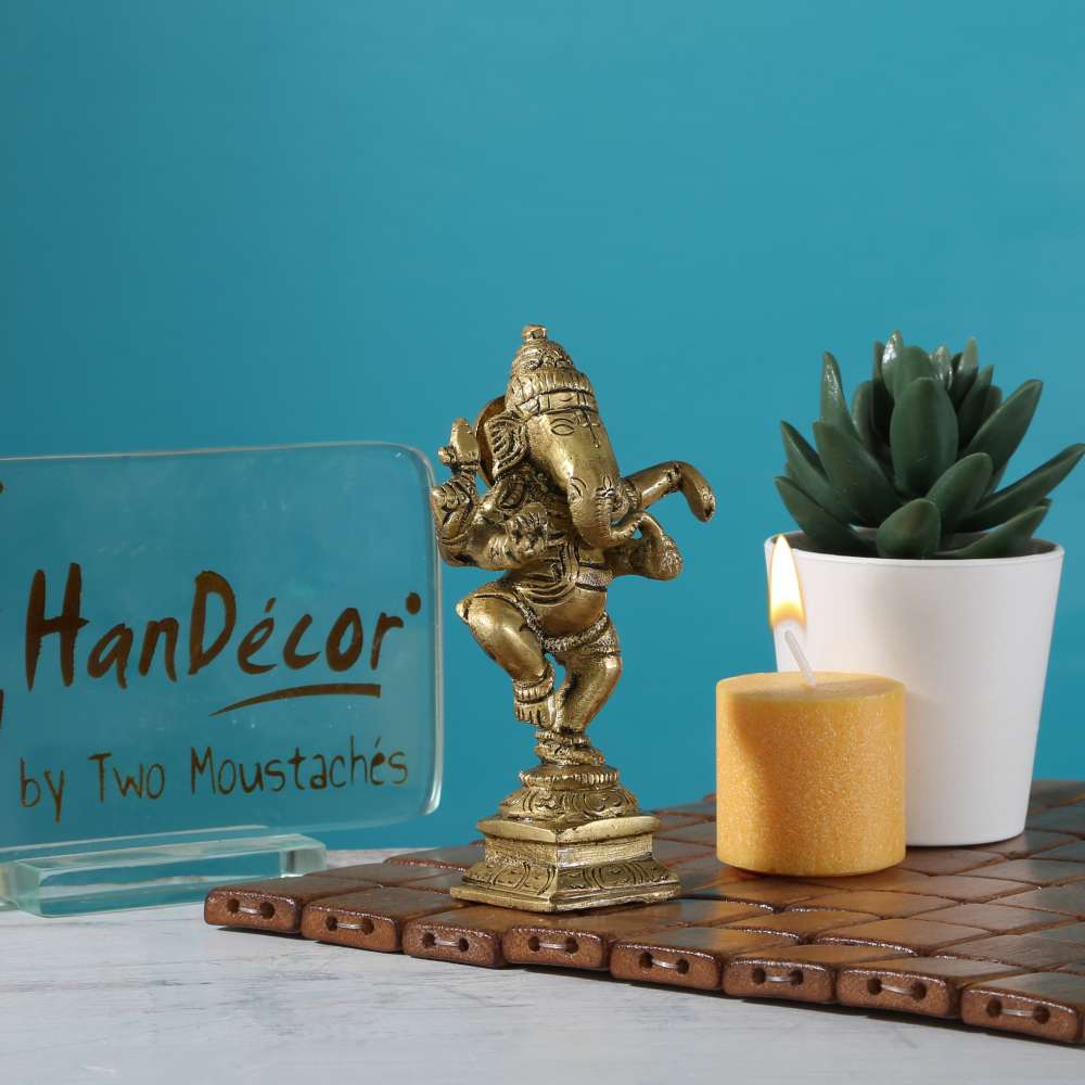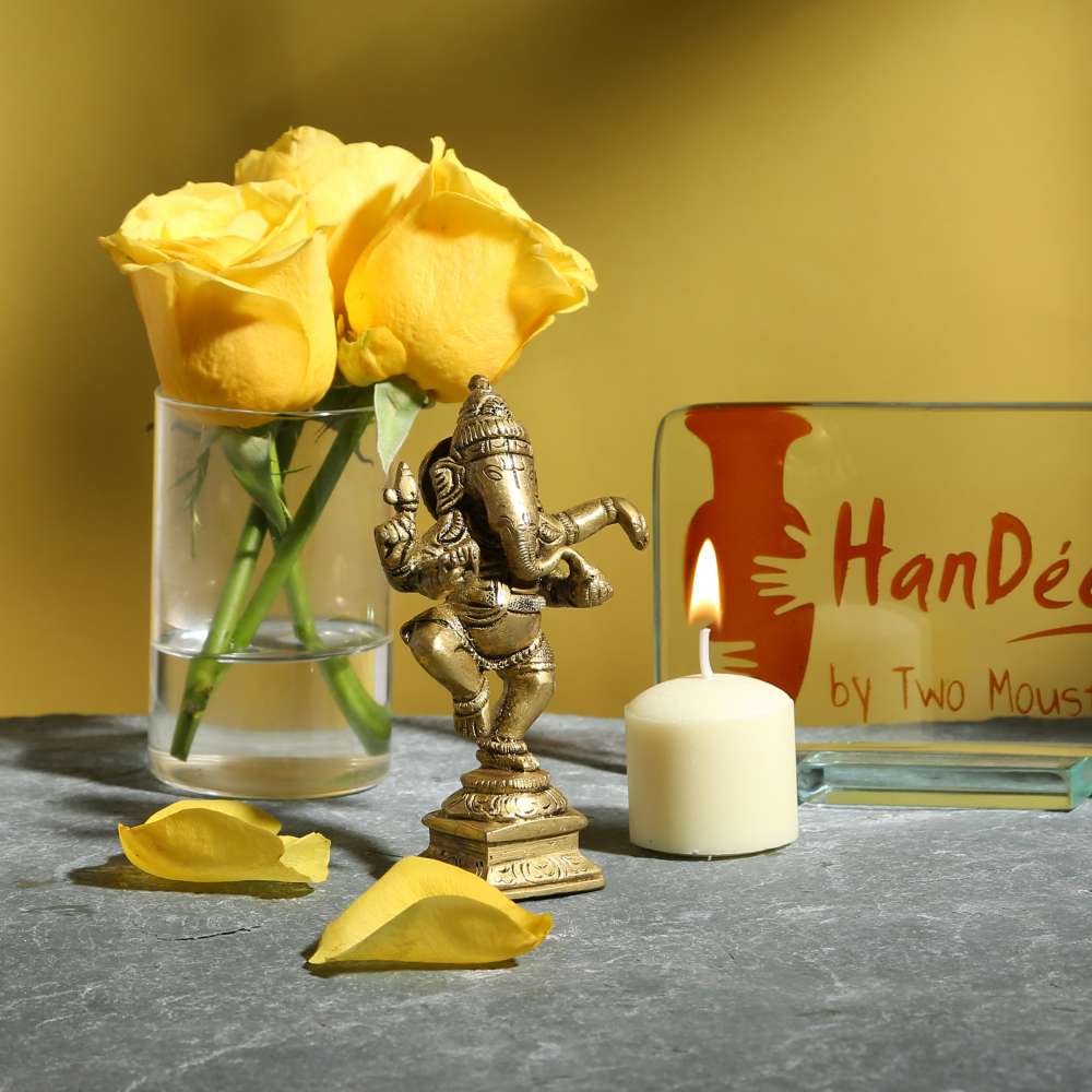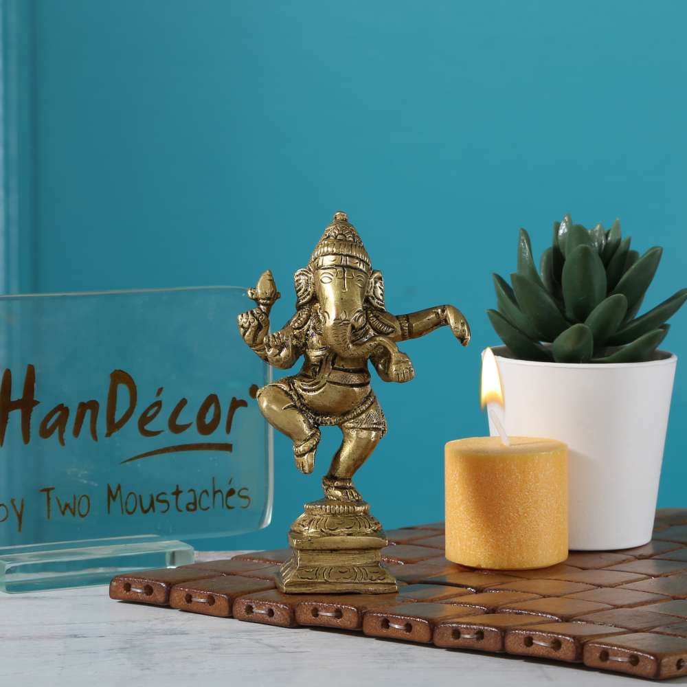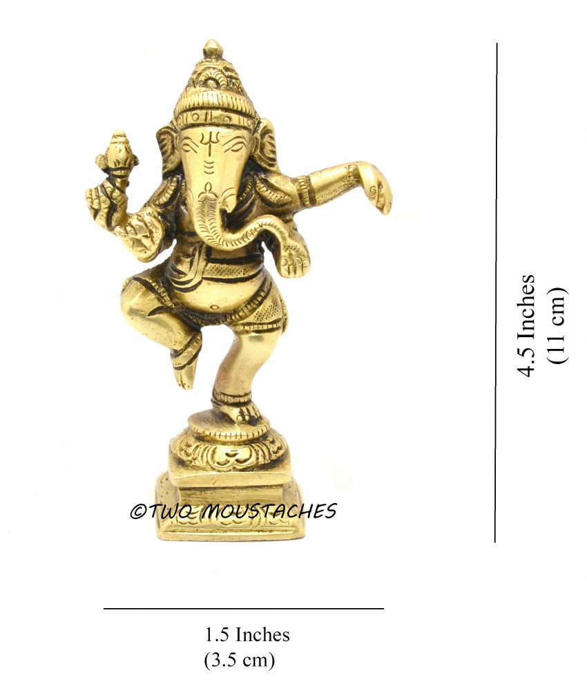 Place the Two Moustaches Dancing Ganesha Brass Idol on any shelving unit and add to its looks. Depicting Lord Ganesha in a dancing posture, this showpiece looks elegant. The fine details of Lord Ganesha's ornaments and mukut give this idol a charming appeal. This also makes a great decorative item for your home. Excellent gift for occasions like house warming's and other traditional functions.