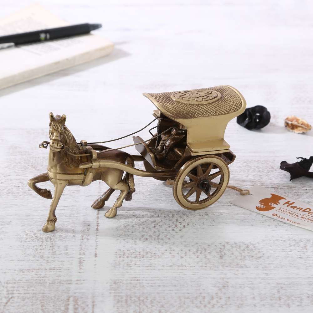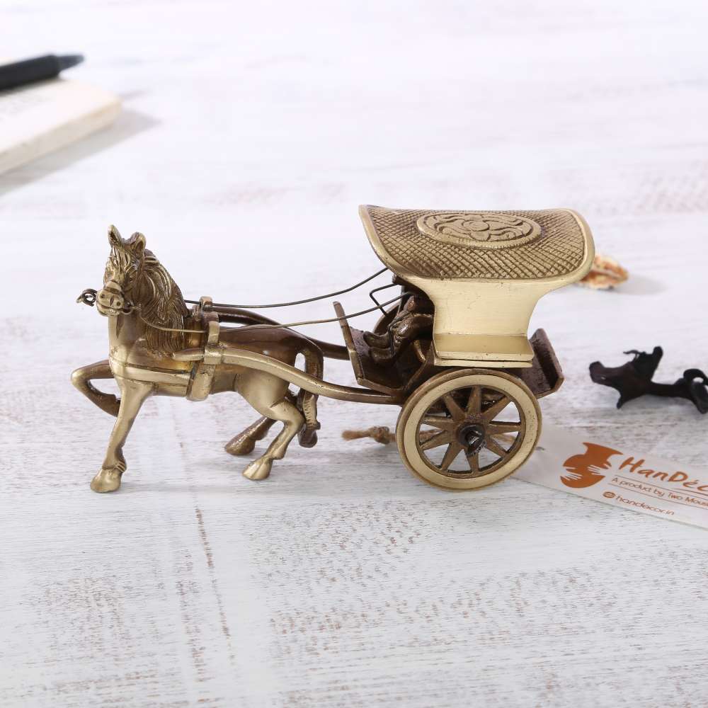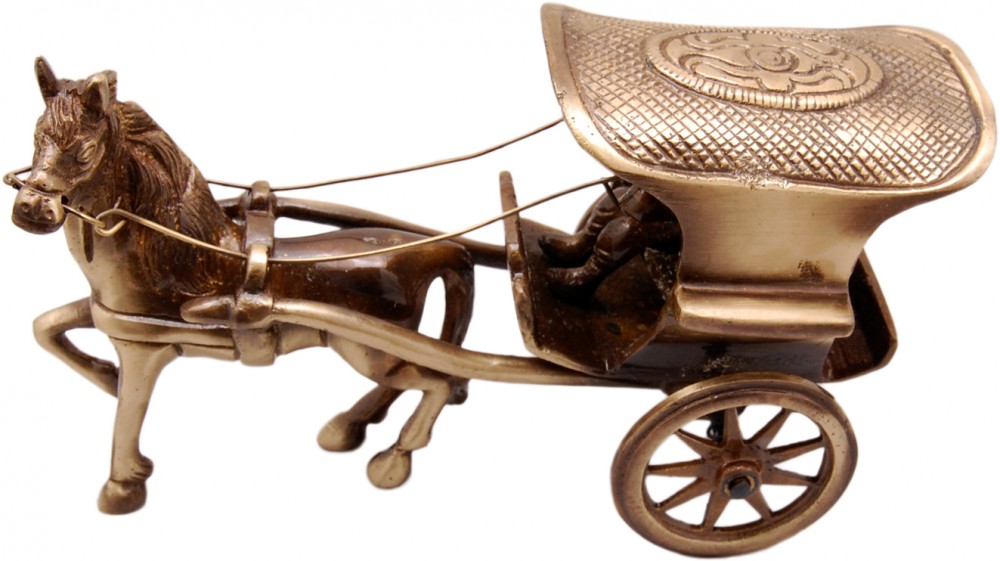 The Horse cart or better called as the Chariot takes us back to the ancient times where horses were used as the prominent mode of transportation. This magnificently crafted horse cart has a man riding on the back of the horse with a cart attached to it.