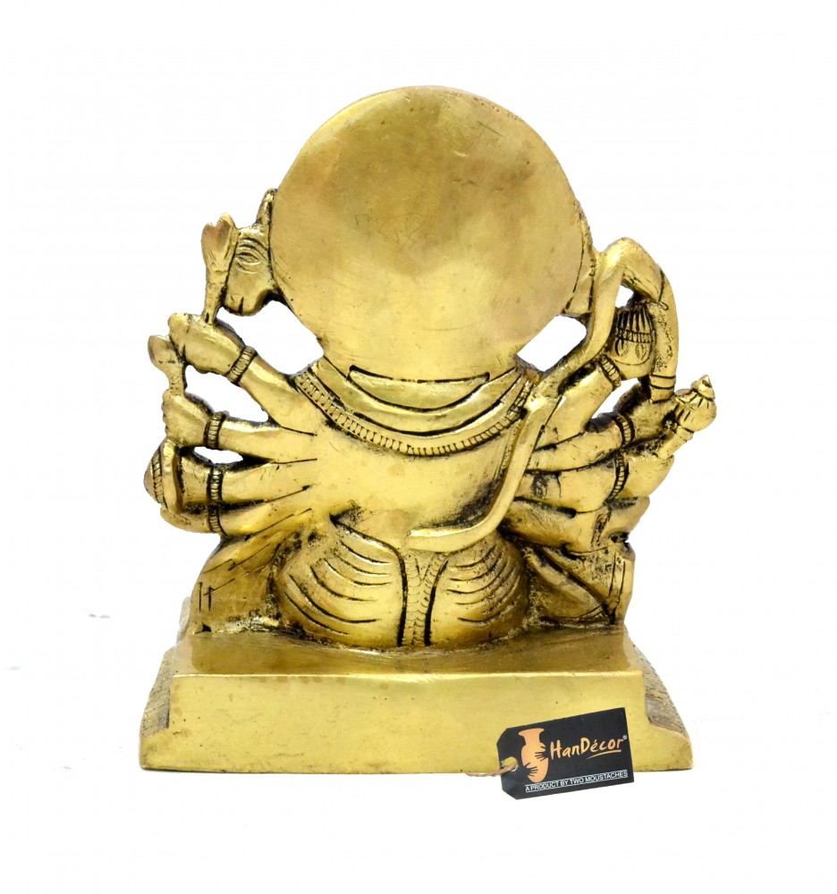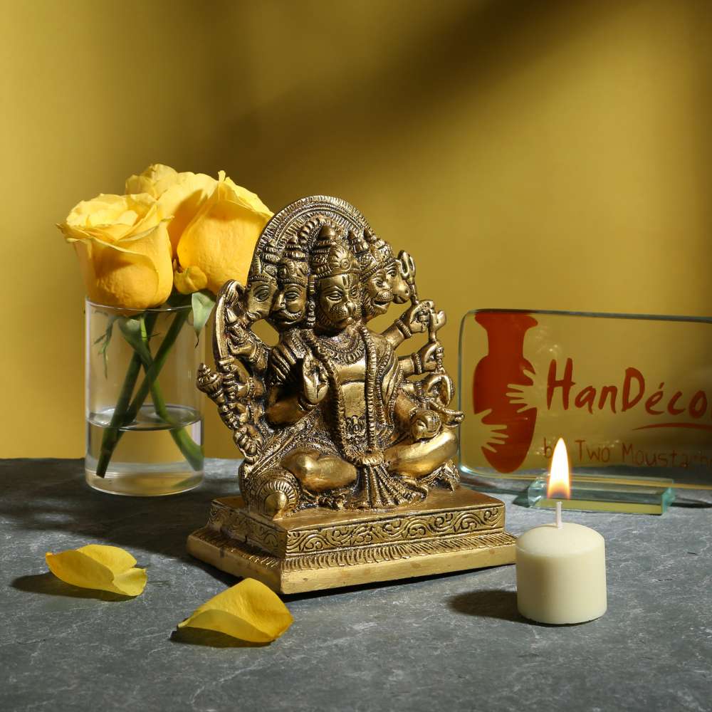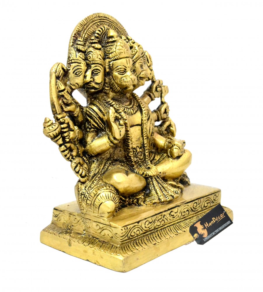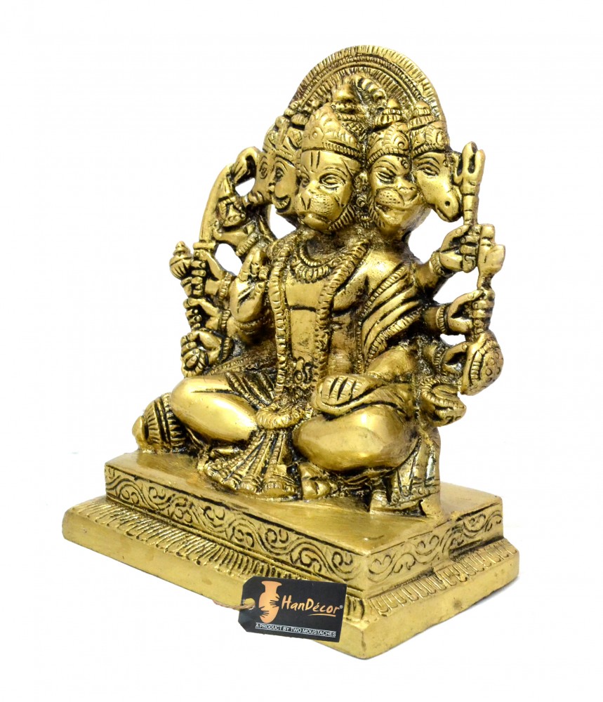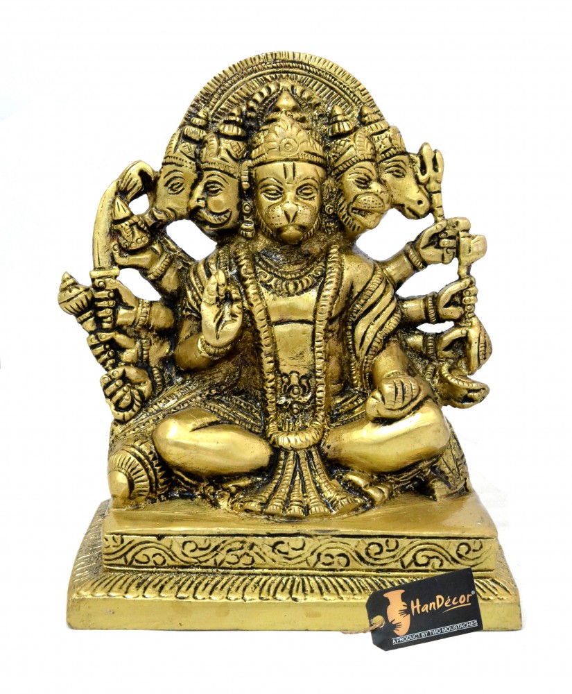 Hanuman,a hindu deity is an ardent devotee of Lord Rama. This mighty ape is a symbol of physical strength,perseverance and devotion. syncretic form of Hanuman with five heads and ten arms, incorporating in the composite image five important Vaishnavite deities: At the center a monkey's face (Hanuman). This Two Moustaches Brass Hanuman Ji Statue will bestow his blessings on your family and fill your home with divinity and devotion. The brass make of the statue add sheen and makes it very easier to clean. A lion's visage representing Narasimha gazing southwards. An eagle's head symbolizing Garuda facing west. A boar head of Varaha (north). A horse's face for Hayagriva (facing the sky). Each head signifies a particular trait. Hanuman courage and strength, Narasimha fearlessness, Garuda magical skills and the power to cure snake bites, Varaha health and exorcism and Hayagriva victory over enemies.