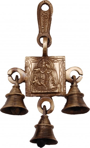 This Radha Krishna Bell hangs from brass hooks, and it is 6 inches tall. This Bell can be used outdoors or indoors, so you can let the wind resonate the bell. It is made out of brass with an antique finish applied.Such bells can also be hanged at home and ringing of bells removes negative energy and brings positive energy at home.