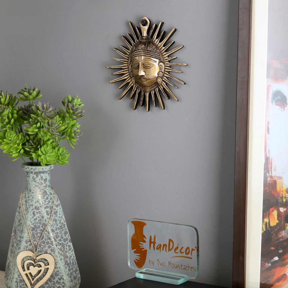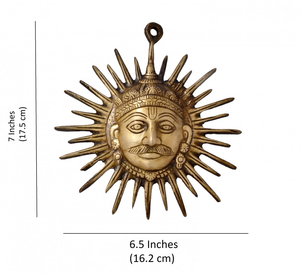 Enlighten your dwelling with this unique antique decorative Surya Wall Hanging from handecor. Surya symbolizes the Sun God, the Lord considered as the only visible form of God that can be seen every day. He is regarded as the provider of power, knowledge, courage and intelligence. This flawless array of attractive piece is made from pure brass which makes it highly robust and durable with huge shine that remains vivid for years. Bring good luck for everyone in the family by placing this 6.5x7 inches Wall décor over the main door of your house.
