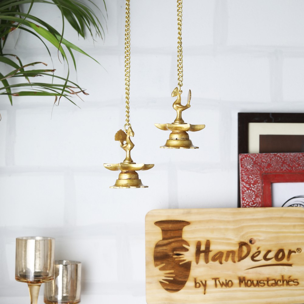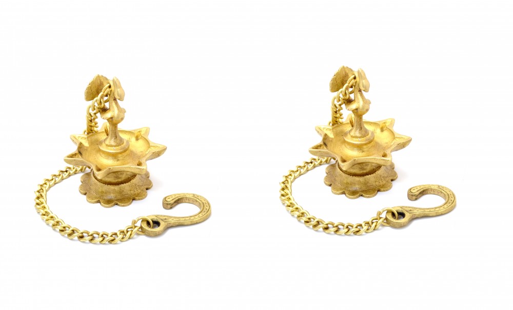 Light up your home with this beautiful Peacock Diya. Crafted from quality brass material, this golden colored diya set features a peacock inside a traditional diya. People light up these wick lamps for performing aarti of Gods they worship. These are also used as diwali lights, when homes are all lit up on the dark amawasya night. There is also beautiful peacock seated on each of the lamp. The lamp set comes with a hanging chain. Made in brass, this is a solid piece of collectible figurine sculpture that you would be happy to keep at your home. Gift your loved ones this attractive diya set for special occasions.