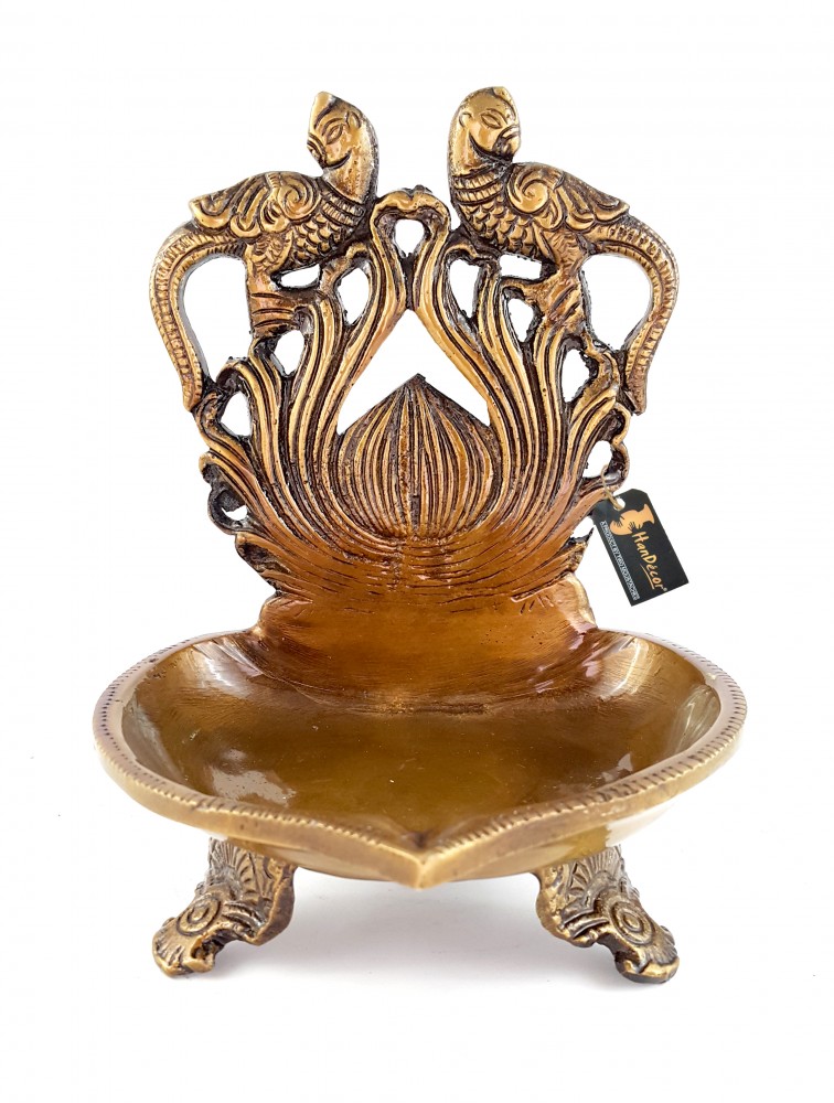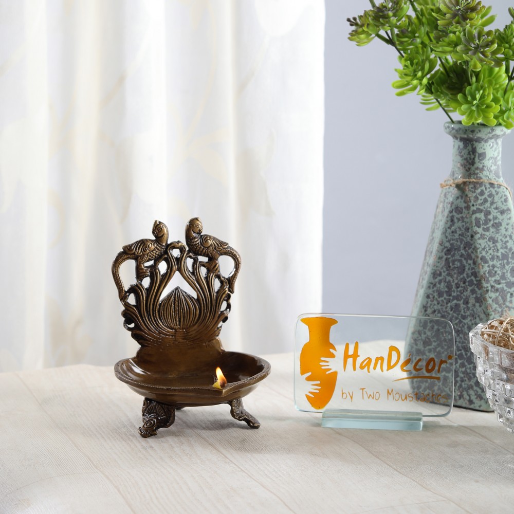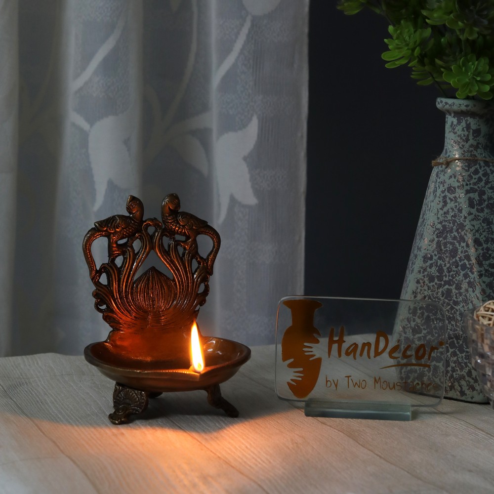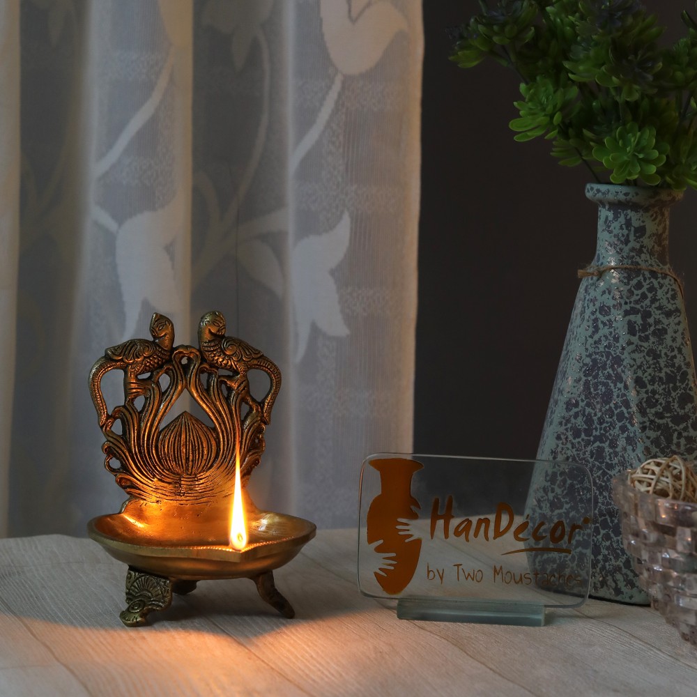 This Deepak or Diya isn't just a Diya. Its a multipurpose decorative embellishment for all modern homes. This product has been designed quite intelligently and features twin peacock at the top. The brass Diya's are included in this table diya, depicting twin peacock are dancing at the top of the Diya. To compliment your house and Diya's, artisans have installed an ethnic handcrafted tri base, making it one of the most pious and auspicious additions to any modern home. The table diya is bright and beautiful for any temple or home. Also makes for a excellent decor piece, collective and gifting option.