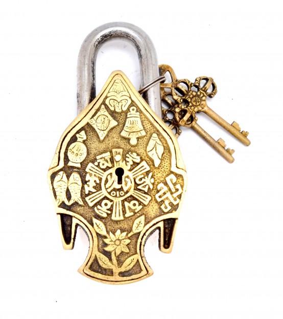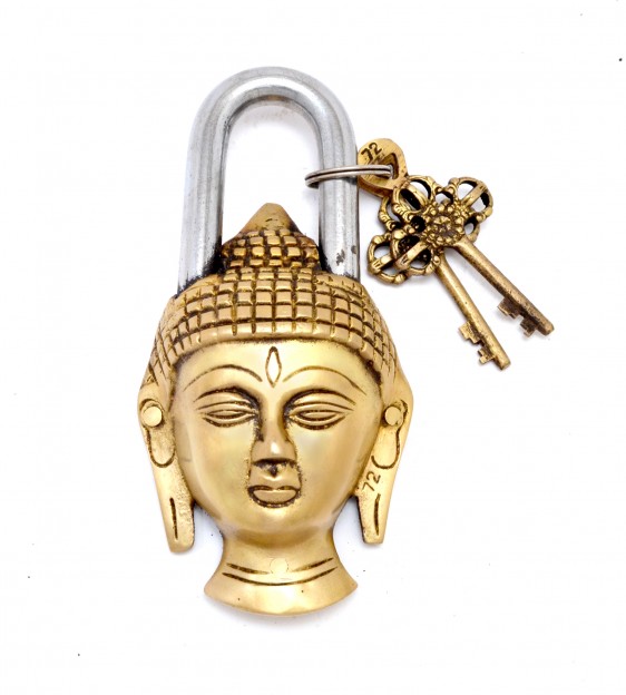 The royal brass locks on ancient mysterious doors is what you remember when you see this piece of art. The lock is made in brass and polished in golden finish. Handcarved in it is Lord Budhdha - "The Enlightened One". An additional feature in the masterpiece is that they keyhole is hidden behind the lock. The brasswork displays the intricacy of the art. The lock comes with two keys and gives an ancient and rich look to your door.