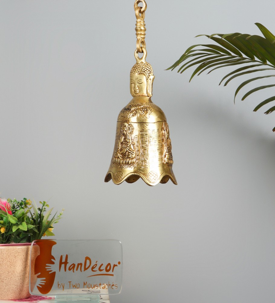Create a unique and peaceful ambiance in your Pooja room with three beautiful Buddha Figurines engraved on this Brass Hanging Bell With Chain. Depicting the symbol of calmness, a beautiful buddha head, on top you can hang this elegant, fantastic and artistic bell with chain in your front door, balcony, worship room or anywhere you like. The fine quality of pure brass produces a harmonious and rich tonal sound. Made of golden brass, the bell has a serene and classy effect wherever suspended. It makes a very special gift.So, grab for yourself or your nears & dears one now.