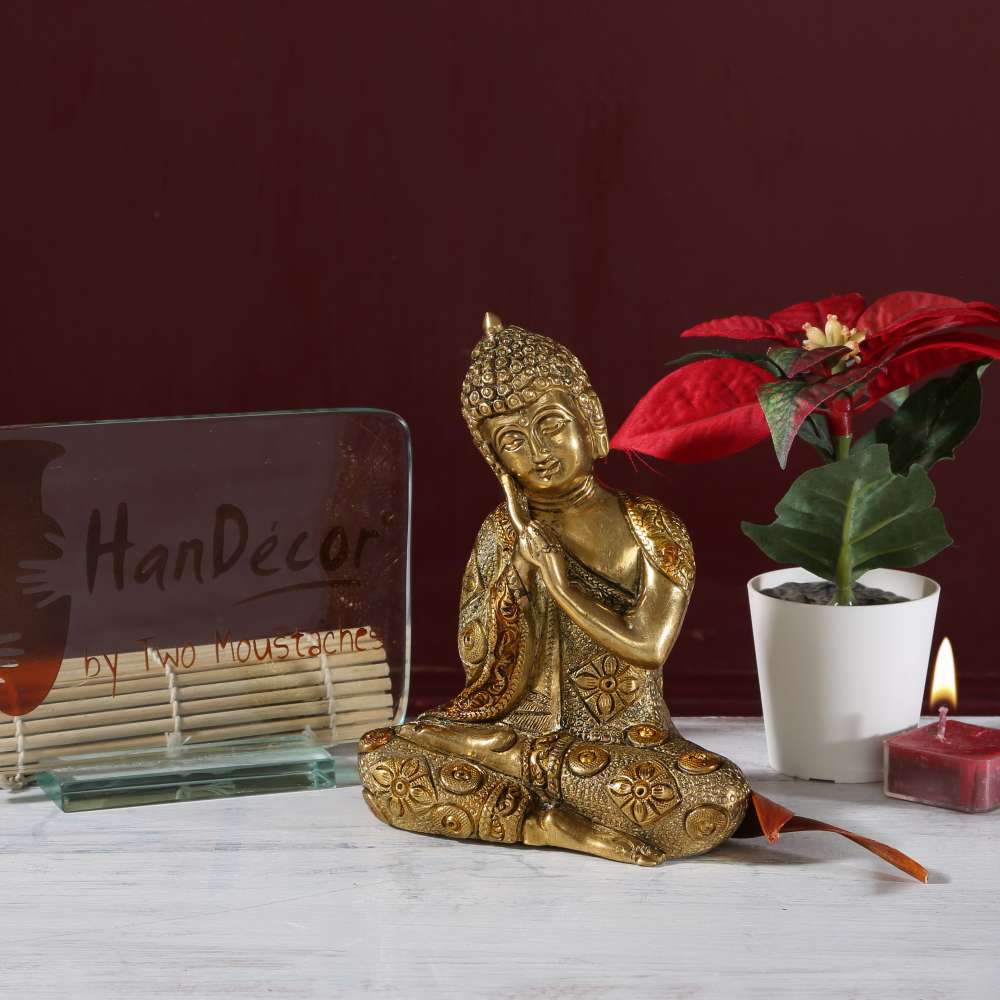 Give your home space a divine and peaceful atmosphere with a peaceful Buddha showpiece. Get this resting Buddha with beautiful detailing to the antiqued finish dress. Enhance your home and garden by this graceful new rare & lucky Buddha statue, symbol of peace and harmony. This hand carved statue is very unique and of high quality. This mudra of Buddha symbolizes enlightenment, as well as steadfastness.