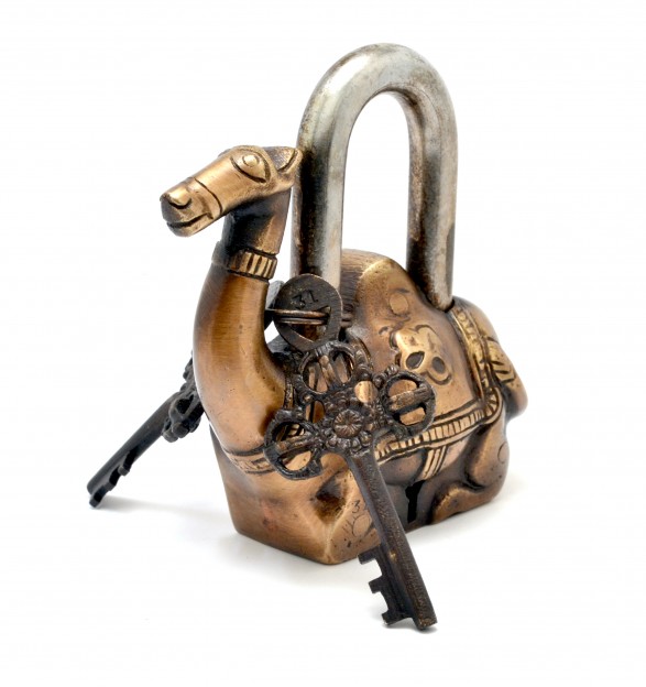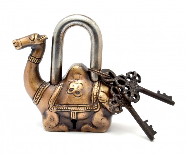 The royal brass locks on ancient mysterious doors is what you remember when you see this piece of art. The lock is made in brass and coated with golden finish. Hand carved in it is a Camel. An additional feature in the masterpiece is that they keyhole is hidden below the camel. The lock comes with two keys and gives an ancient and rich look to your door.