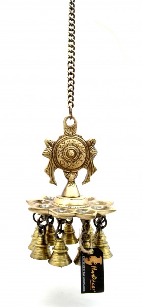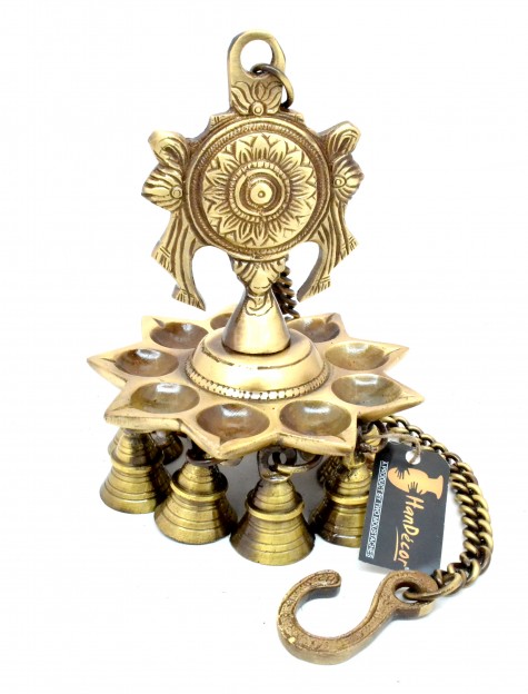 Brass Diya is a traditional spiritual items. It can be used with oil to light up your decoration or home and it can also be hanged with chain and small bells which sounds good when hanging. This handmade metal craft is unique for gifts and decoration. Ring in prosperity and good fortune to your home by getting this Chakra Design deepak hanging with bells . This wall hanging is made of brass and features Chakra on the top and has a diya at the bottom with bells below each diya. his can be a good gifting option for house warming parties too.