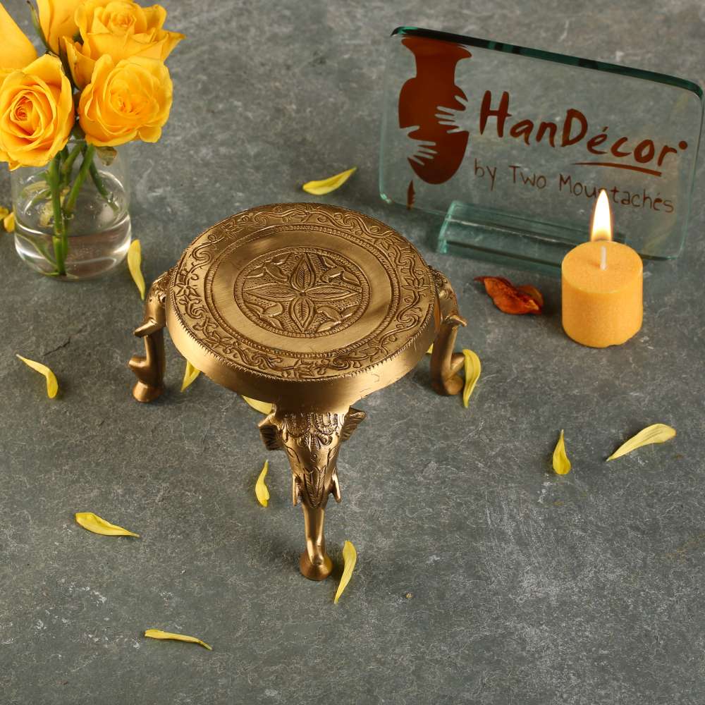 Handecor Brass Pooja Chowki with Elephant Pillars is a wonderful product from the house of Handecor, known for crafting appealing art pieces. This chowki is made with brass and is easy to maintain. The long-lasting chowki has beautiful elephant designs on the pillars that look charming and bring good luck to your house. It can be used to place anything that you desire.
