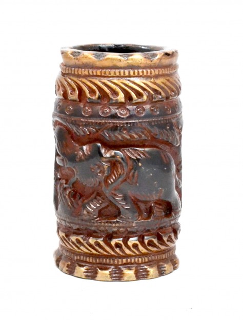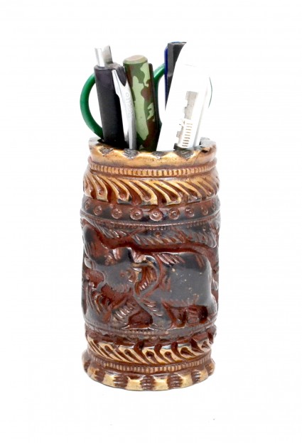 Add an artistic touch to your office or home space with this hand carved pen stand made in polished brass. Carved with running elephant design and intricate designs that create a beautiful piece of art. Ideal for gifting to family and friends.