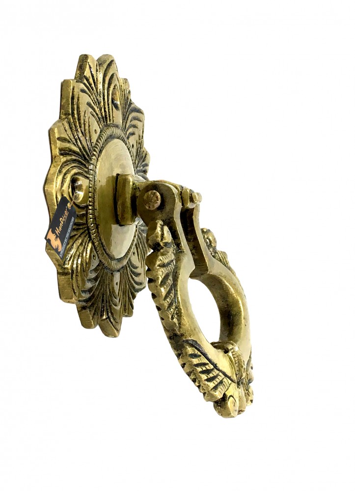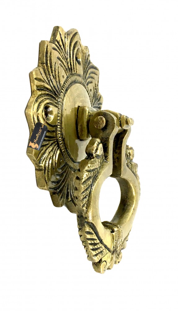 Your guests will be in for a surprise the next time they come visiting, courtesy this Ethnic Carving Peacock over Ring Brass Door Knocker in a round shape from Two Moustaches. Featuring a unique design, this door knocker looks appealing. Beautifully detailed with a heavy knocking ring, you'll be certain to hear your guests announce themselves.Definitely sets your home apart from the crowd! Made from brass, this door knocker is durable, sturdy and will certainly garner attention from your guests.Immensely classy to say the least, this antique brown marvel is crafted from brass for that extra special finish!