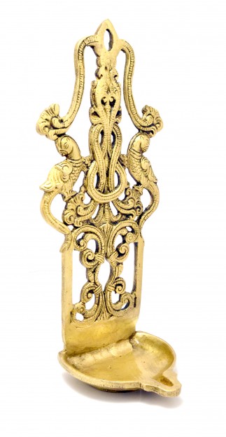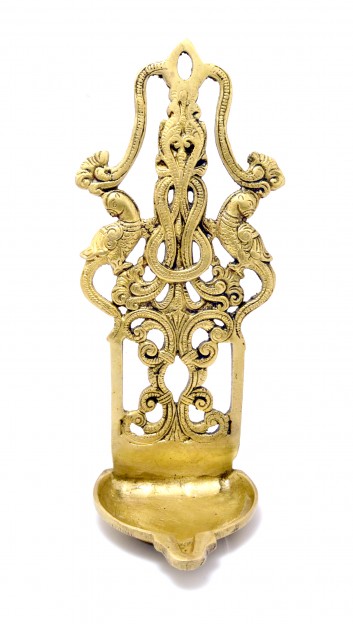 There is a diya in this wall hanging lamp that can contain sufficient oil to keep burning for many hours. There are also two beautiful peacock seated on the corners of the lamp. This lamp can be placed on table and as well as can be hanged on wall as well. Made in brass, this is a solid piece of collectible figurine sculpture that you would be happy to keep at your home