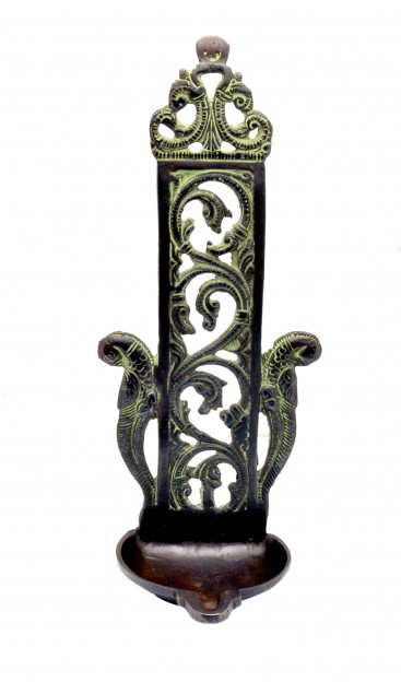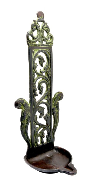 There is a diya in this wall hanging lamp that can contain sufficient oil to keep burning for many hours. There are also two beautiful peacock seated on the corners of the lamp. This lamp can be placed on table and as well as can be hanged on wall as well. Made in brass, this is a solid piece of collectible figurine sculpture that you would be happy to keep at your home.