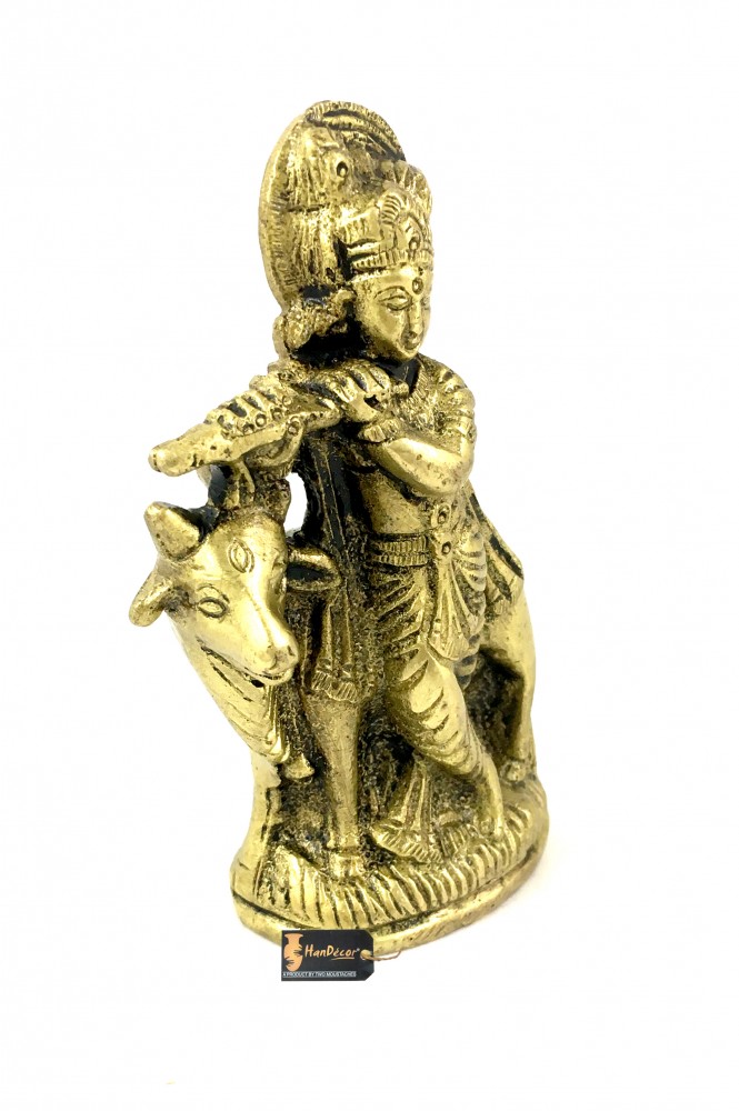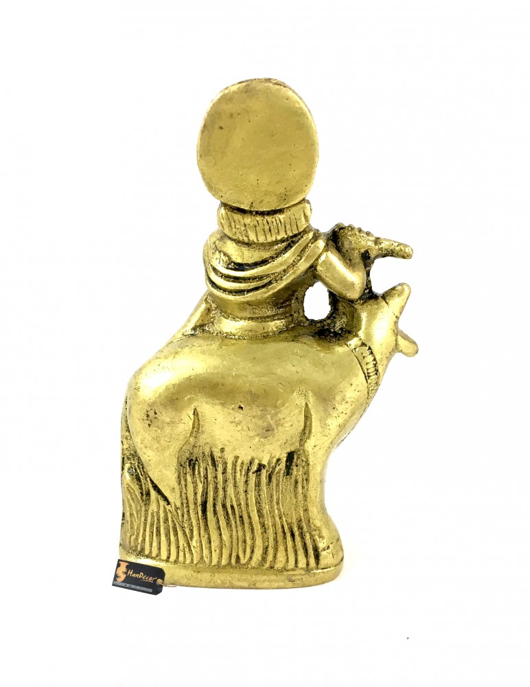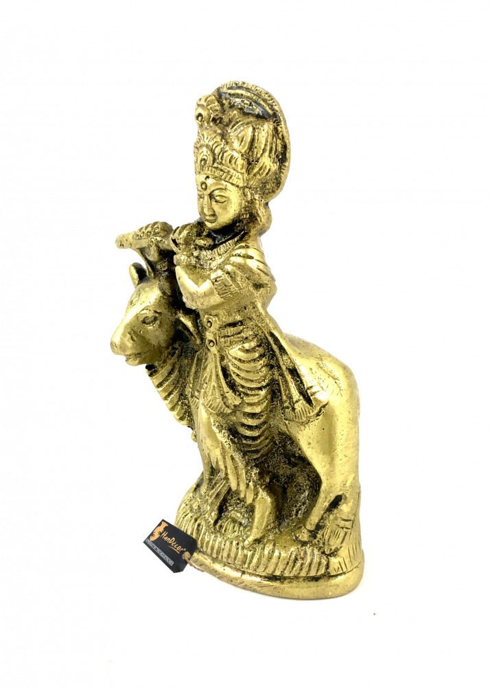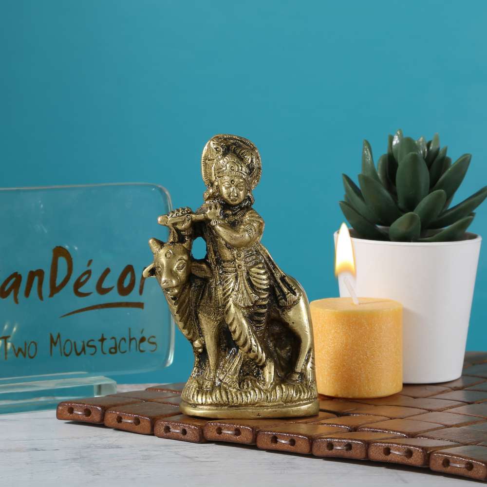 This amazing piece of art by Two Moustaches is a brass Krishna with cow statue. Cows are considered very sacred in Hindu mythology. The love between Krishna and cow is depicted in this artefact. The figurine is beautifully carved. The radiance and the shine are very attention seeking. Cows and Krishna have always been together. In His original form in the spiritual world, Krishna is a cowherd boy in the agricultural community of Goloka ("cow planet") Vrindavan, where He keeps unlimited, He shows us the importance of cows to human society, the practical benefits of caring for them. This piece of ultra royal artefact can be used to beautify your interiors or can be gifted on birthdays, anniversary, housewarming etc.