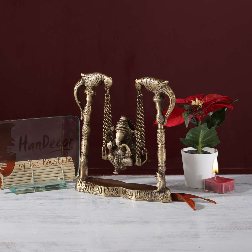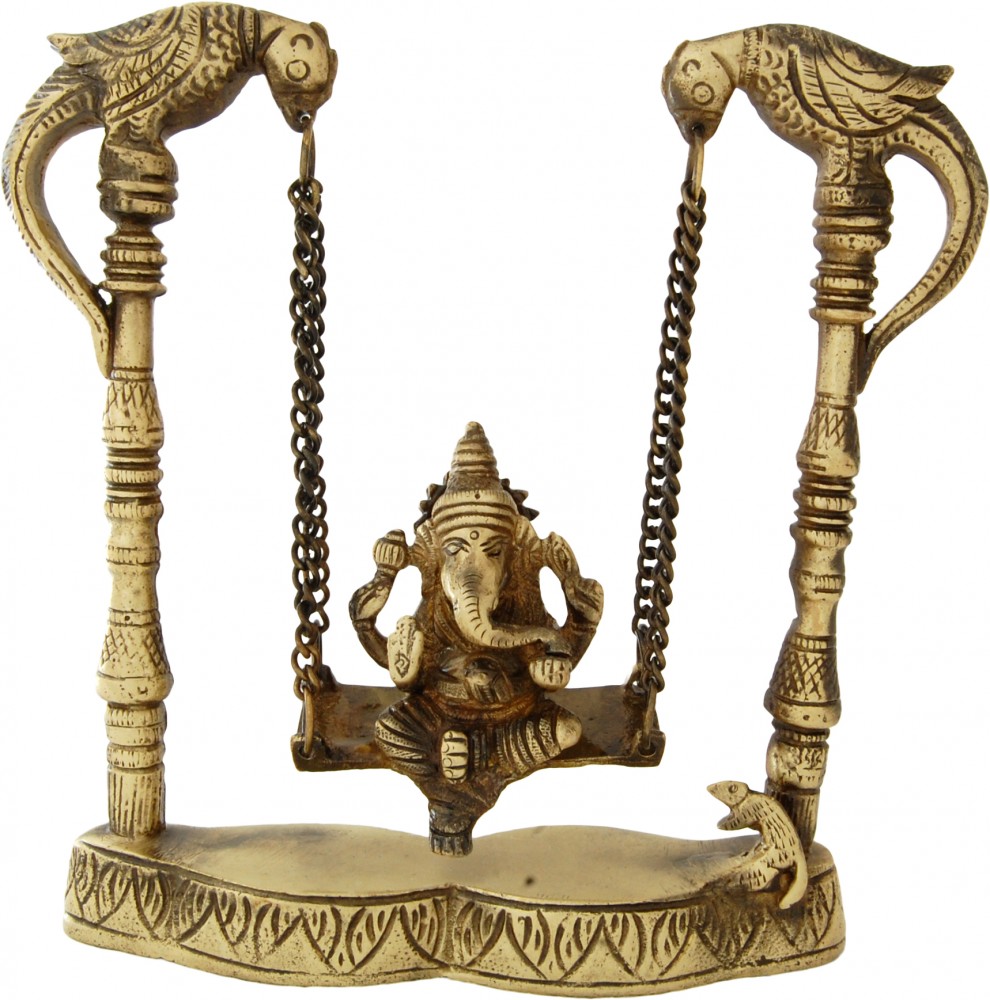 A spiritual deity 'Ganesha' swings in a full mood of enjoying. The two parrots on upper side holding both chains of jhoola with her beak. A small mouse (Ganesha Sawari) is sitting near his feet. The best ever idol for your Mandir in home. This whole idol of Ganesha Jhoola is made of brass material.