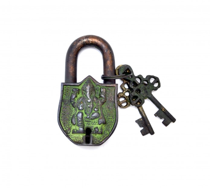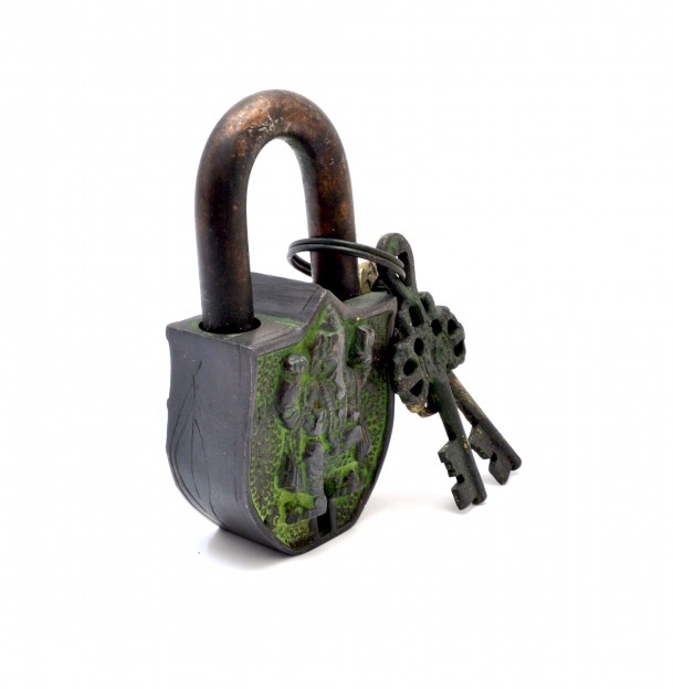 The royal brass locks on ancient mysterious doors is what you remember when you see this piece of art. The lock is made in brass and coated with green powder. Handcarved in it is our own Lord Ganesha, the god of New beginnings. An additional feature in the masterpiece is that the auspicious Symbol "Om" is engraved at the back of lock.The lock comes with two keys and gives an ancient and rich look to your door.
