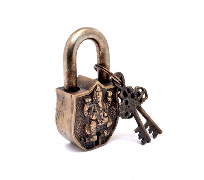 The royal brass locks on ancient mysterious doors is what you remember when you see this piece of art. The lock is made in brass and coated with golden finish. Handcarved in it is our own Lord Ganesha, the god of New beginnings. An additional feature in the masterpiece is that the auspicious Symbol "Om" is engraved at the back of lock.The lock comes with two keys and gives an ancient and rich look to your door.