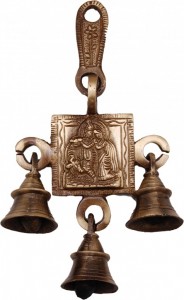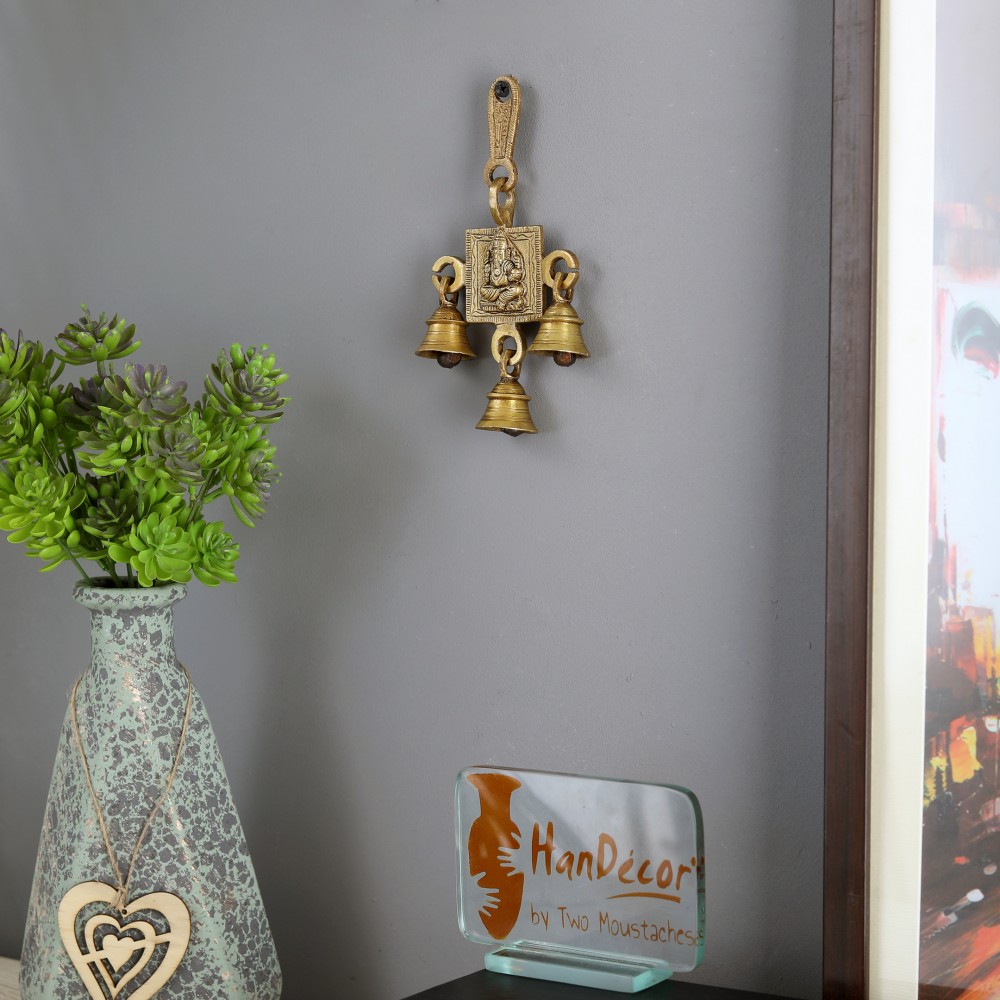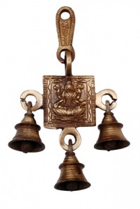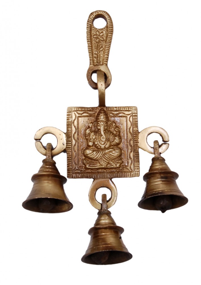 This Ganesha Bell hangs from brass hooks, and it is 6 inches tall. This Ganesha Bell can be used outdoors or indoors, so you can let the wind resonate the bell. This particular Brass Ganesha Bell is made out of brass with an "antique" finish applied. Also, the bell is very clear sounding. Such bells can also be hanged at home and ringing of bells removes negative energy and brings positive energy at home.