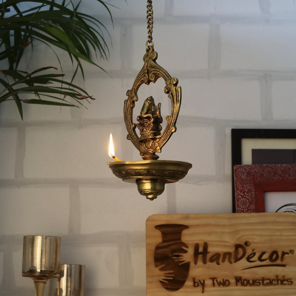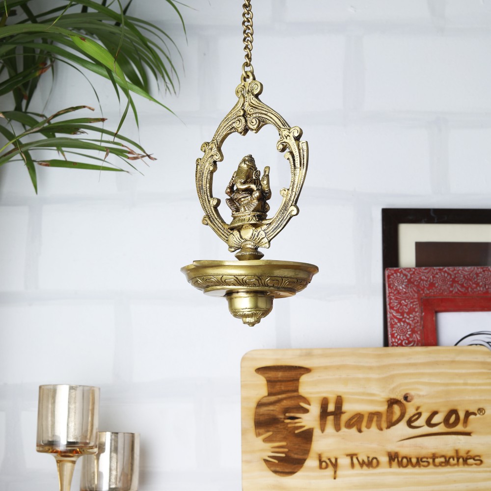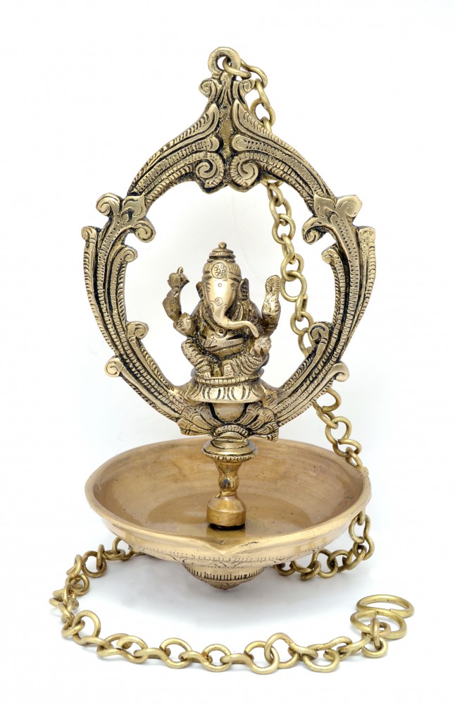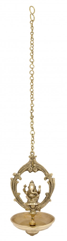 This is a unique piece of lamp used in many devout hindu homes for puja purposes. People light up these wick lamps for performing aarti of Gods they worship. These are also used as diwali lights, when whole India gets lighted on the dark amawasya night. There is a diya in this lamp set that can contain sufficient oil to keep burning for many hours. There is also beautiful idol of Ganesha seated on the top. The lamp set comes with a hanging chain. Made in brass, this is a solid piece of collectible figurine sculpture that you would be happy to keep at your home.