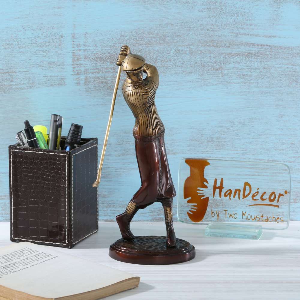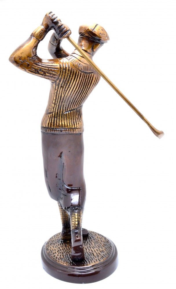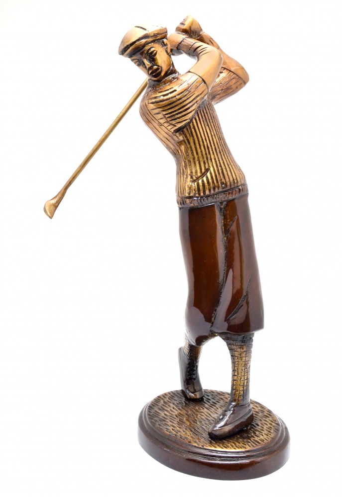 This gorgeous piece depicts a player that has completed his swing and is looking off in into the distance to follow his shot. A unique display piece and a must addition for any golf enthusiast. Great gift idea for a special occasion - you'll love it! Brilliant detail brings this golfer alive . Felt bottom to avoid scratches and made of high quality Brass, this statue is a must for all the Golf Lovers !