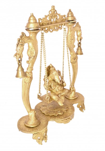 Hindu God Ganesha Statue is the Lord of success and destroyer of evils and obstacles. Lord Ganesha Statue is known to Bring prosperity and happiness in your home & Office. He is also worshiped as the god of education, knowledge, wisdom and wealth. This statue represent Hindu Lord Ganesha sitting on a swing with a striking pose. This Statue shows a spiritual deity 'Ganesha' swings in a full mood of enjoying.This is an unusual and charming solid brass sculpture with fine detail, of Lord Ganesha on a swing.Lord Ganesha is often seen in homes, offices (including ours), on desks and anywhere that help is needed. He is also the patron of arts and sciences, and the deva of intellect and wisdom. A small mouse (Ganesha Sawari) is sitting near his feet. The perfect eye catcher for your Mandir in home. This whole idol of Ganesha Jhoola is made of brass material. Crafted very carefully, this is an exclusive product from the house of Two Moustaches.