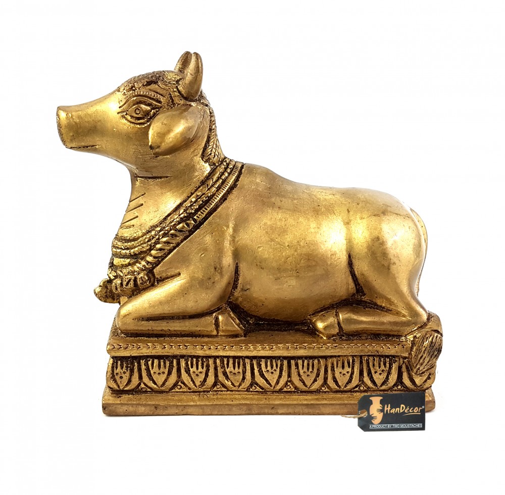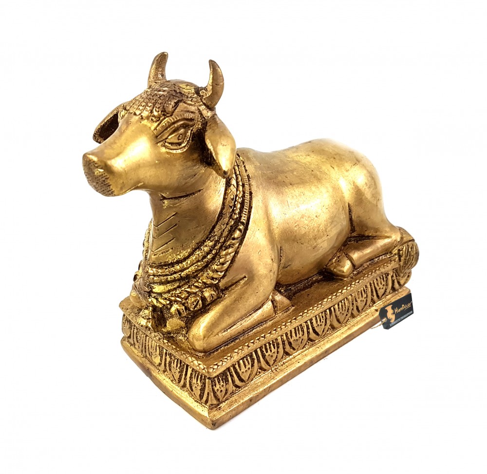 This statue depicts Nandi in a sitting posture and should be a marvelous addition to your home. Nandi represents the creative energies of the restless mind brought under control by focusing on Shiva who is Pure Consciousness. Kneeling in reverence and worship waiting to serve his Lord Shiva the nandi is a symbol of purity and strength. This brass nandi radiates its own inner strength and a divine energy.
