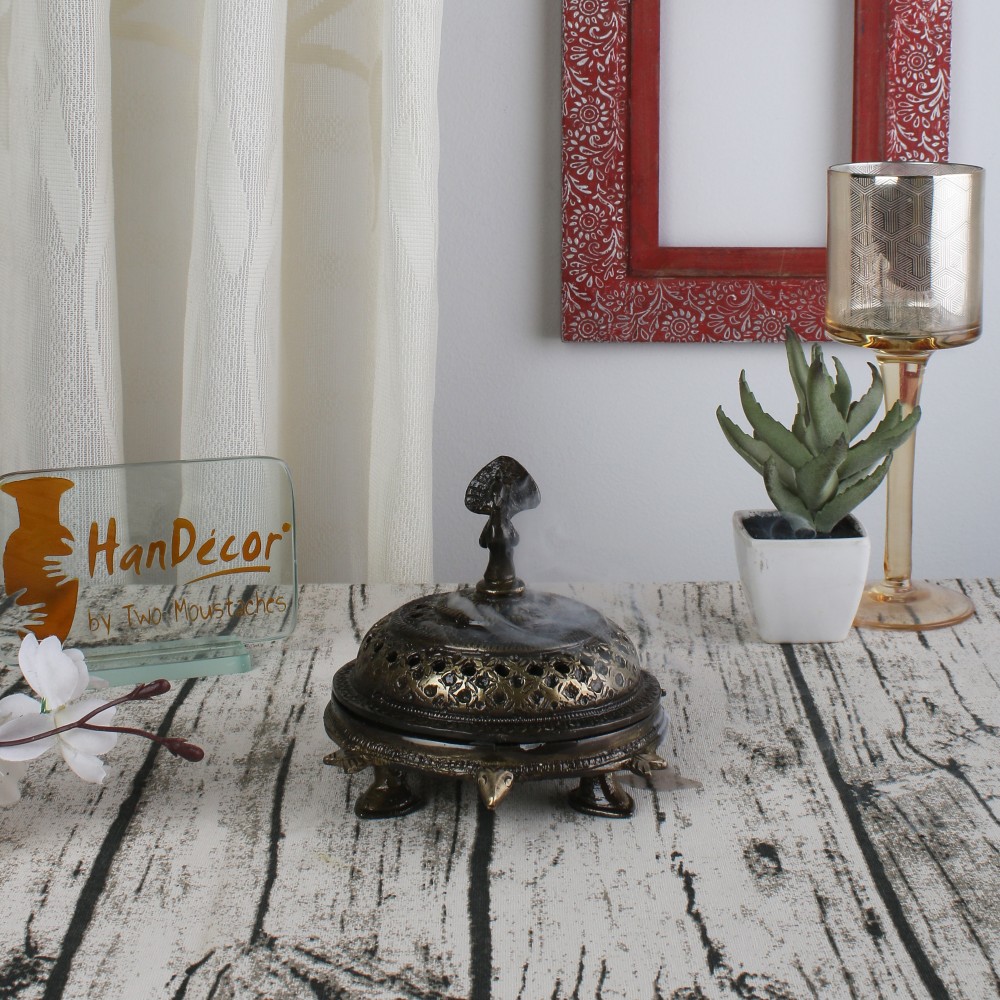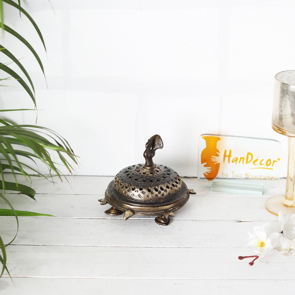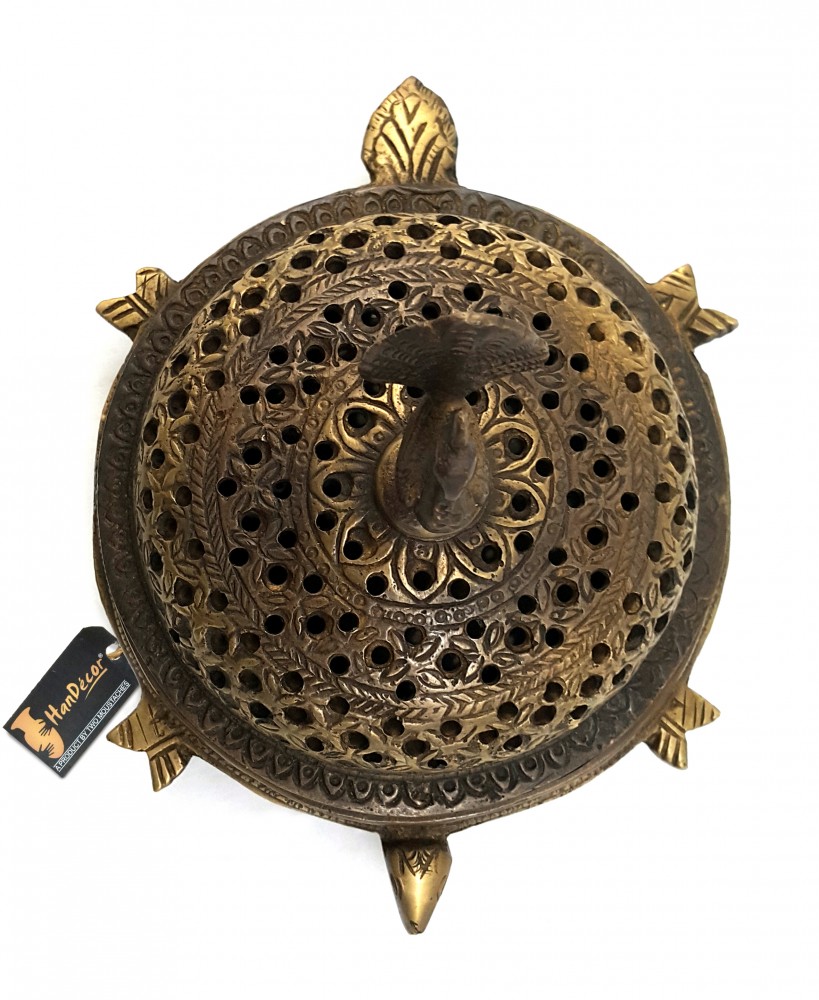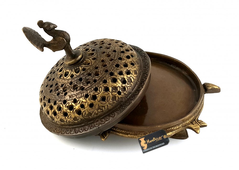 This is an exquisite Incense holder hand casted in solid brass by artisans from North India. The base of the box sits on a three legged tortoise brass stand. The base is used to light the Dhoop ( Dhoop is the cone incense ) and once lit , it is covered with the lid to spread the fragrance of the flavored incense all around the room. The lid is a masterpiece with an intricate design and is decorated with a beautiful handcrafted peacock in brass. The holes in the lid can be used to light the Agar bati ( incense sticks) by standing the same into the holes.. This brass stand may also be used as a candle stand or and oil lamp with a wick dipped in oil.