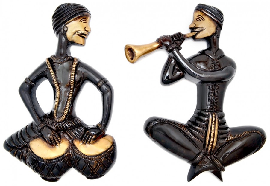 Here is a set of two folk musician figurines from India. The two musicians are seated; one playing percussion instrument tabla, and another playing wind instrument shehnai. While playing the instrument, each musician is looking sideways, facing one another. Each figurine is 8 inches high and has a groove on the back for hanging on the wall. Artisans have handcrafted these brass metal figurines using sand casting technique. Embellish your wall with this unique home decor musician figurine set.