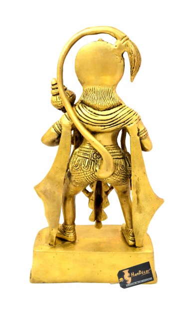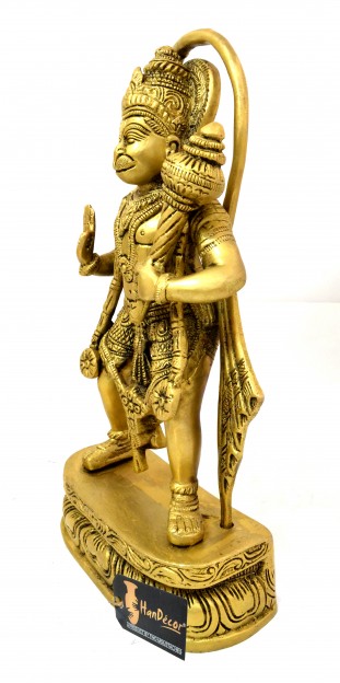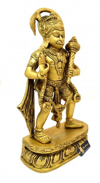 Large heavy Standing Aashirwaad Hanuman bajarang bali hindu idol statue. He is known for his devotion to Lord Ram. It is believed that worshiping Hanuman will give you and your family, a lot of strength and courage. This Two Moustaches Brass Hanuman Ji Statue will bestow his blessings on your family and fill your home with divinity and devotion. The brass make of the statue add sheen and makes it very easier to clean. The Hanuman is a Hindu god, who was an ardent devotee of Rama according to the Hindu legends. He is a central character in the Indian epic Ramayana and its various versions. This idol is a provider of courage, hope, power, Knowledge, Intellect and devotion. He is followed & known to remove all the obstacles and bad phases in life. The mantra chanted for him is " Jai Bajrang Bali". Beautiful Very Rare Hand carved Solid metal brass handwork.