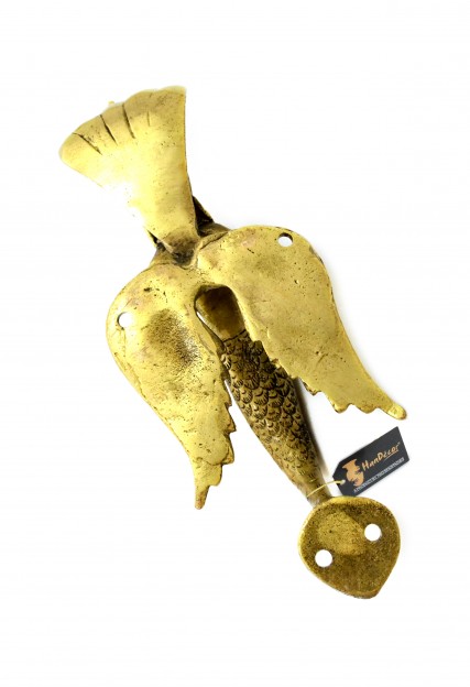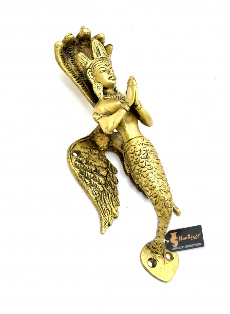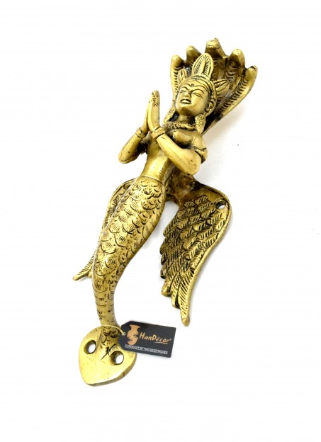 Make your entrance door look attractive and appealing with this beautifully designed Two Moustaches Nagkanya Design Door Handle. Featuring a flying nag kanya (snake lady), this door handle has her wings and her crown. She has five snakeheads that work as an umbrella for her human head. She is holding her hand palms in greeting posture. Made from brass, this door handle is durable, sturdy and will certainly garner attention from your guests. The handle itself is very strong and durable, therefore it will last you for years altogether. Because of its excellent craftsmanship, the product can also be gifted to friends and family.