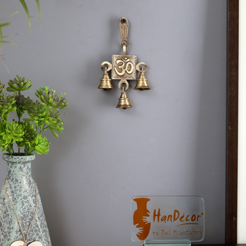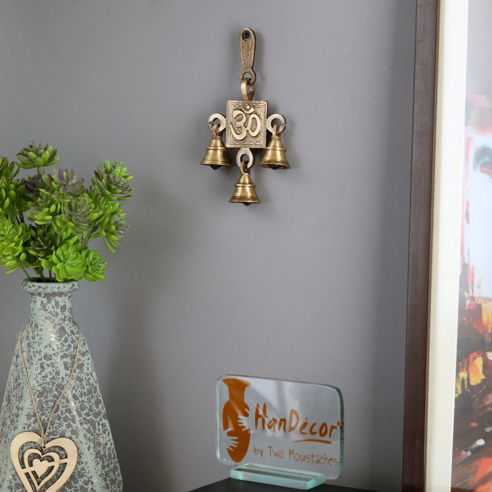 A beautiful wall hanging bells with religious sing made in brass metal with antique finish. Perfect for decorative and religious purpose. Also can you door decoration. Unique wind chims for your home or office.