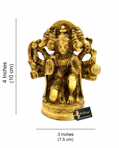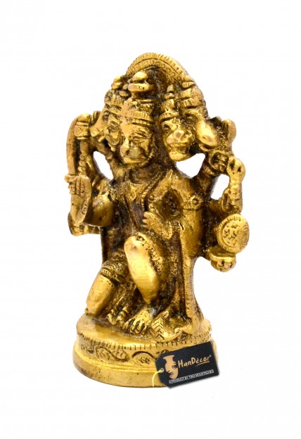 Hanuman,a hindu deity is an ardent devotee of Lord Rama. This mighty ape is a symbol of physical strength,perseverance and devotion. syncretic form of Hanuman with five heads and ten arms, incorporating in the composite image five important Vaishnavite deities: At the center a monkey's face (Hanuman). This Two Moustaches Brass Hanuman Ji Statue will bestow his blessings on your family and fill your home with divinity and devotion. The brass make of the statue add sheen and makes it very easier to clean. A lion's visage representing Narasimha gazing southwards. An eagle's head symbolizing Garuda facing west. A boar head of Varaha (north). A horse's face for Hayagriva (facing the sky). Each head signifies a particular trait. Hanuman courage and strength, Narasimha fearlessness, Garuda magical skills and the power to cure snake bites, Varaha health and exorcism and Hayagriva victory over enemies.