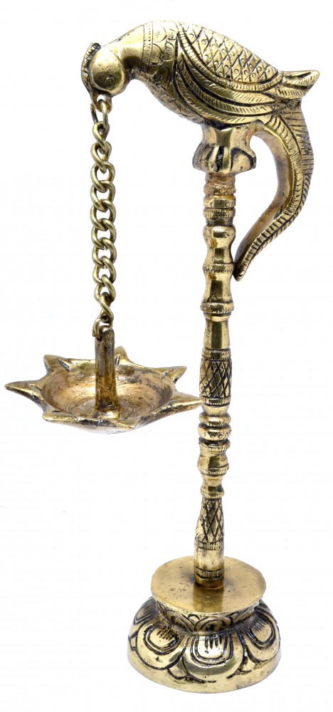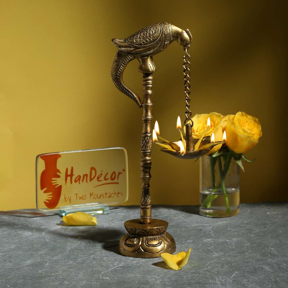 This parrot lamp from Two Moustaches is used in temples, pooja rooms, meditation halls and prayer rooms. Light up your home with this beautiful parrot diya. Crafted from quality brass material, this golden colored diya features a parrot holding a traditional diya. Gift your loved ones this attractive diya for special occasions.