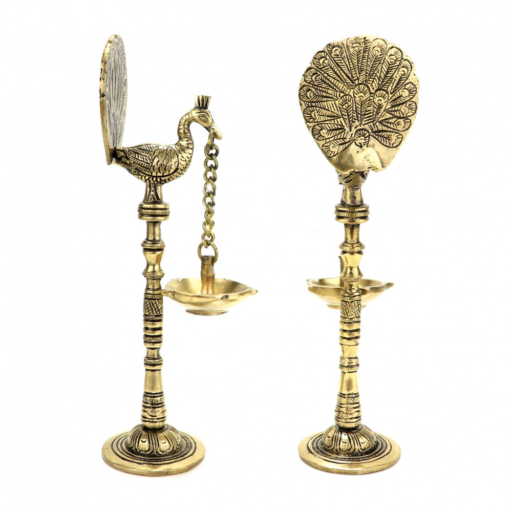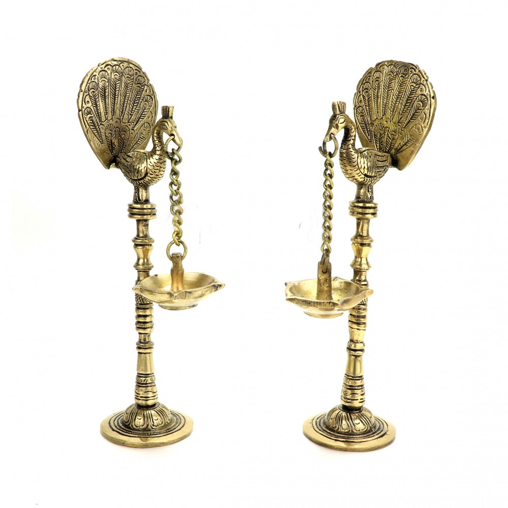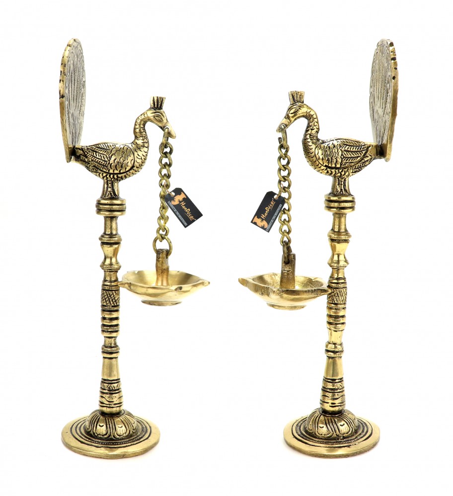 This peacock lamp pair from Handecor - A Two Moustaches Brand , is used in temples, pooja rooms, meditation halls and prayer rooms. Light up your home with this beautiful parrot diya. Crafted from quality brass material, this golden colored brass decorative diya features a peacock holding a traditional diya. Gift your loved ones this attractive diya for special occasions as it definitely will be an eye catcher to its onlookers.