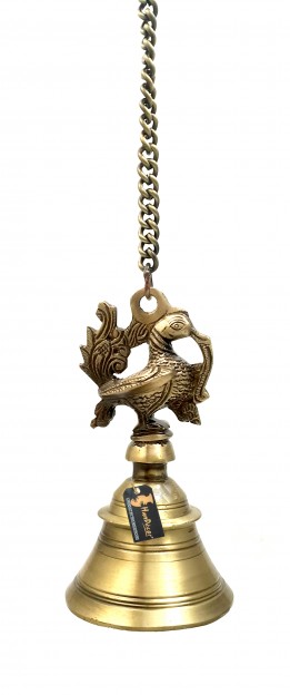 Bells used in Hindu ceremonies and temples are also called "Ghantas".This exquisite brass bell crafted by skilled artisans has a peacock with full plumage and is hand crafted out of solid brass and hangs on a brass chain with links. One can find temple bells in all sizes and heights hanging at the entrance of all temples in India and it is tradition to ring the bell while entering or exiting the temple once prayers are over as a sign of good omen. The chiming of bells are also rung to start all puja / prayer ceremonies. The ringing of the bells signifies offerings to the Gods and is supposed to be the first sound of creation, Om and as per the old saying, are also meant to to keep evil forces away.