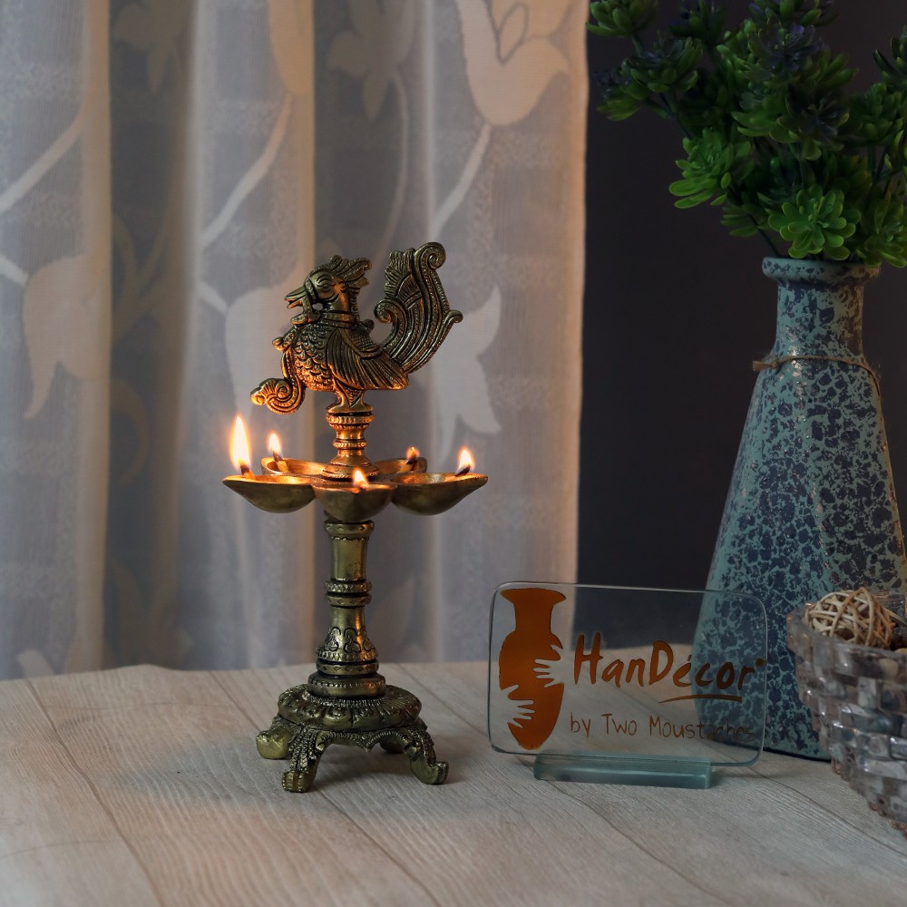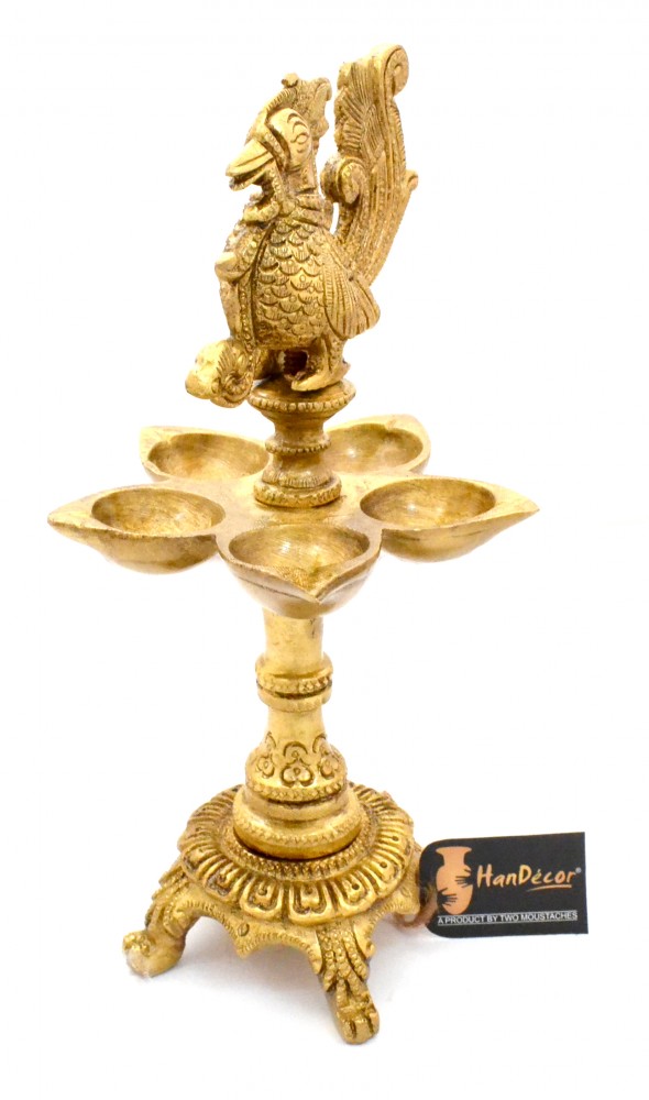 Lend a visual treat to all those visiting you by getting this Two Moustaches Peacock Design 5 Oil Wick Brass Diya. Made of good quality brass, this gold-colored oil diya is shaped like a peacock and has a beautiful 5 wicks for oil. Sturdy, easy to maintain and long lasting, this oil diya makes a great addition to any type of decor.