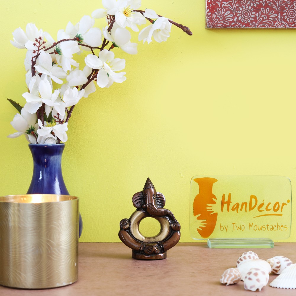 Add an expressive look to your office space decor with the multiple style of this Two Moustaches Ring Ganesha Multicolored Brass Showpiece cum Paperweight. Made of corrosion-resistant and durable brass material, this brown-colored item features our own Lord Ganesha. Easy to polish, this paper weight adds style and substance to your home furnishing.