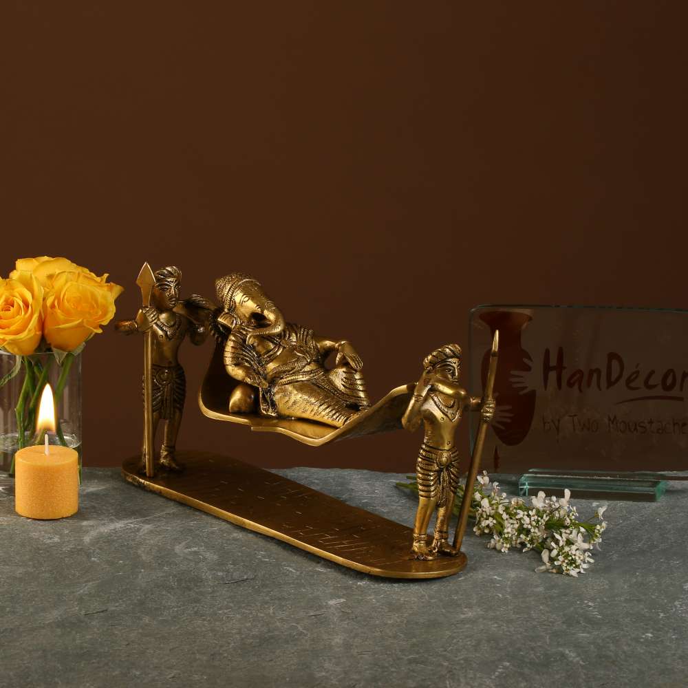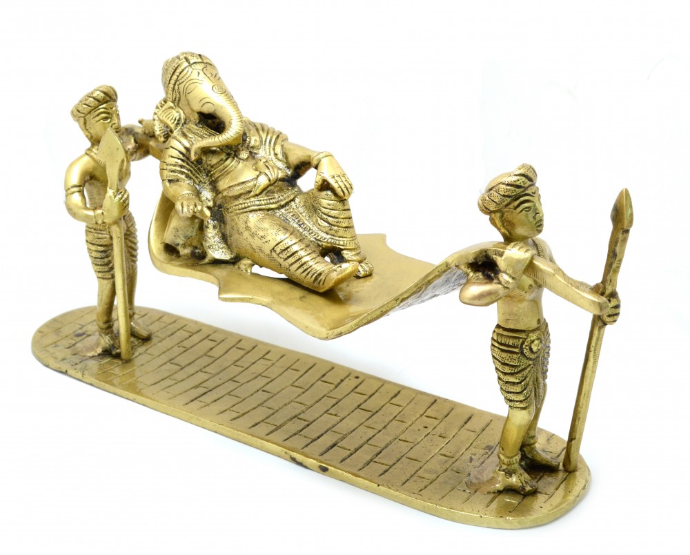 Add a touch of royalty and art to your devotion with this Antique Yellow Brass Ganesh on Palkee Showpiece from Two Moustaches. Made of corrosion-resistant and durable brass material, this item features our own Lord Ganesha sitting royally on his palkee with 2 guards. Easy to maintain, this decorative item can transform the overall style of your home decor.