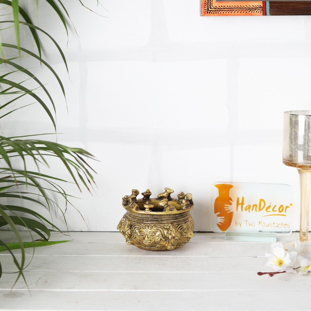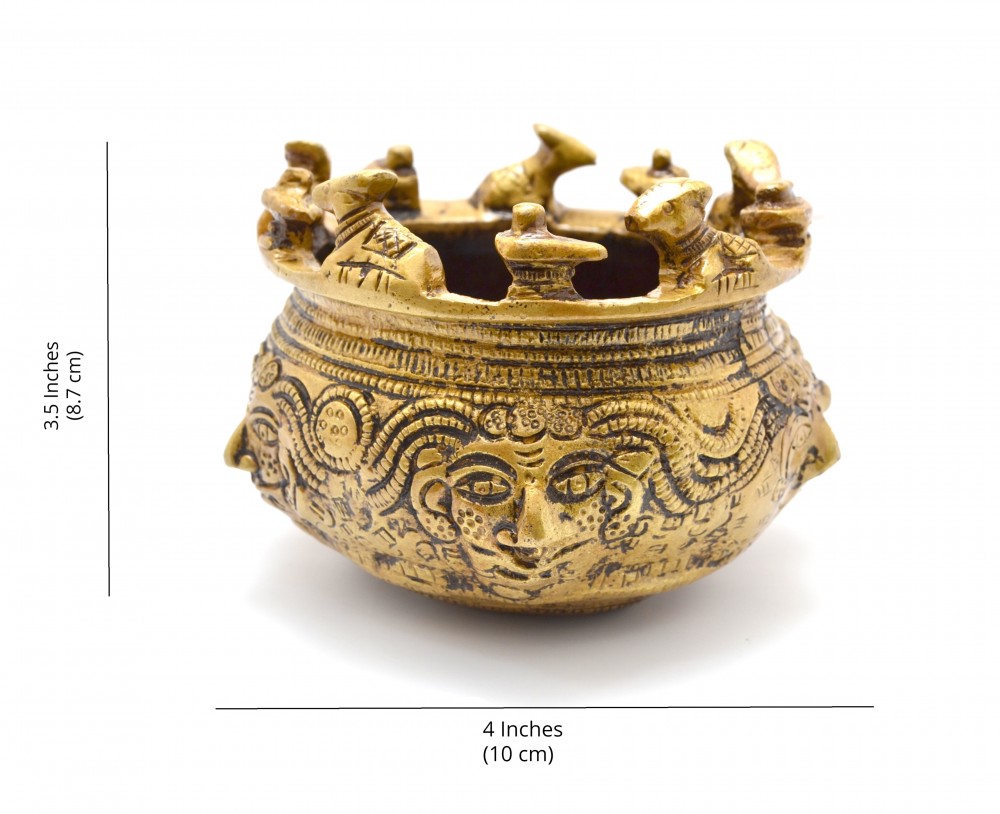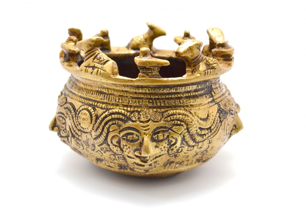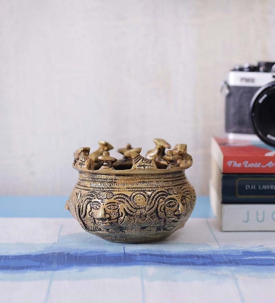 This is a sacred as well as decorative Kalsh with Nandi seated all over its top. Nandi is the name for the bull which serves as the mount (Sanskrit: Vahana) of the god Shiva and as the gatekeeper of Shiva and Parvati. In Hindu Religion, he is the chief guru of eighteen masters (18 Siddhar) including Patanjali and Thirumular. Temples venerating Shiva display stone images of a seated Nandi, generally facing the main shrine.