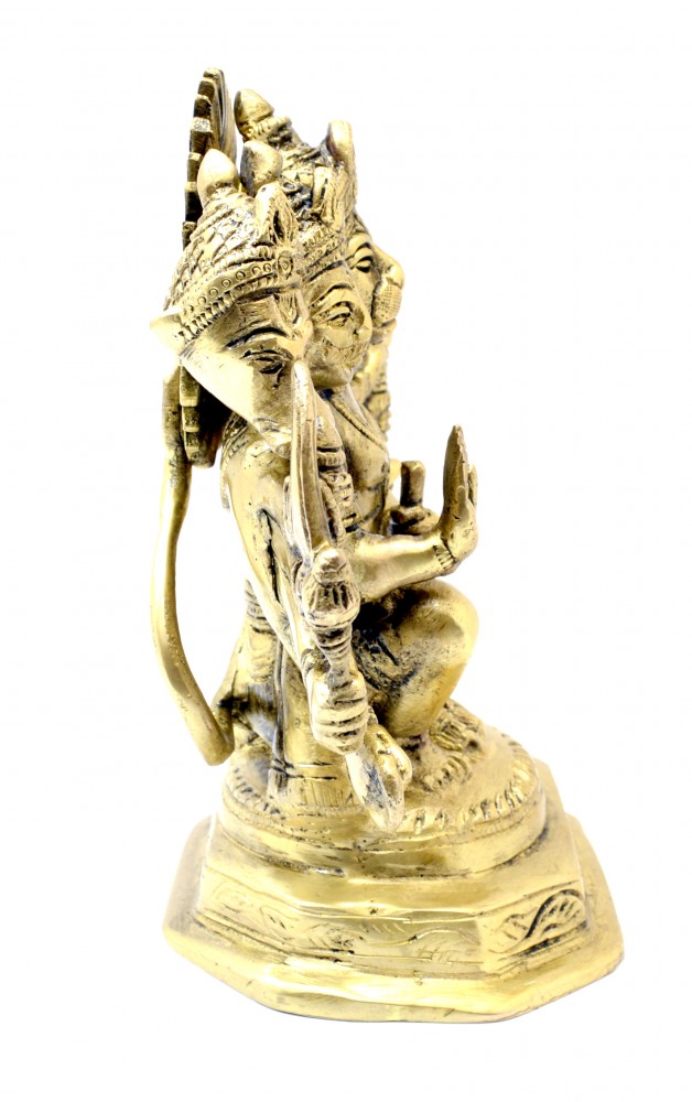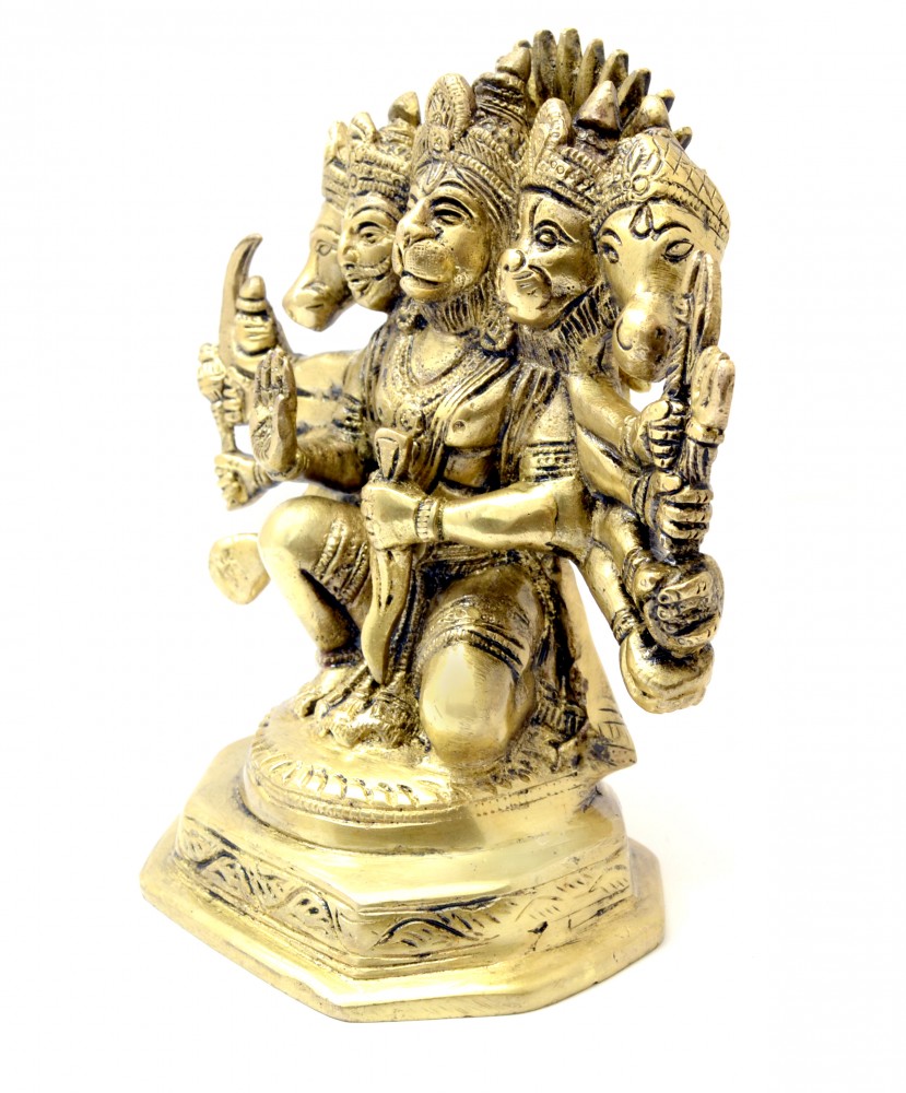 Panchmukhi (Five face) Hanuman statue : The origin of Sri Panchamukhs Hanuman can be traced to a story in Ramayana. as per hindu diety many years back during the war between Lord Rama and Ravana. Ravana took help of Mahiravanka who is the king of Pathala. Lord Hanuman in order to protect Lord Ram and Lakshman formed a fortress with his tail. Mahiravana took the form of Vibeeshana and took Lord Ram and Lakshman to pathala loka. Hanuman entered pathala loka in search of Rama and Lakshmana, He found out that to kill Mahiravana he had to extinguish five lamps burning in five different directions at the same time, so he has taken the Panchamukhi form with Hanuman, Hayagriva, Narasimha, Garuda and Varaha faces and extinguished the lamps and killed Mahiravana. According to Hanumath Prakaranam in Sri Vidyarnavatantram, Anjaneya has five faces (Pancha Mukha) and ten weapons. The five faces are that of Lord Hanuman, Lord Narasimha, Lord Adivaraha, Lord Hayagriva, and Lord Garuda. Hanuman is a great yogi (mystic) having transcended the five senses (Pancha Indriyas). Material : Metal Brass , Size : 7 Inches Tall x 6.5 Inches wide, Weight : Heavy 2.1 Kg
