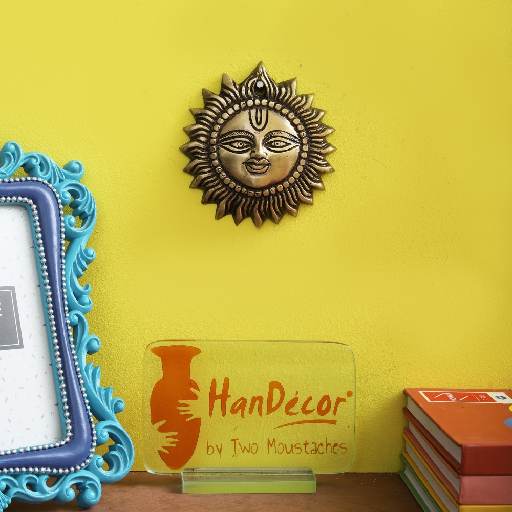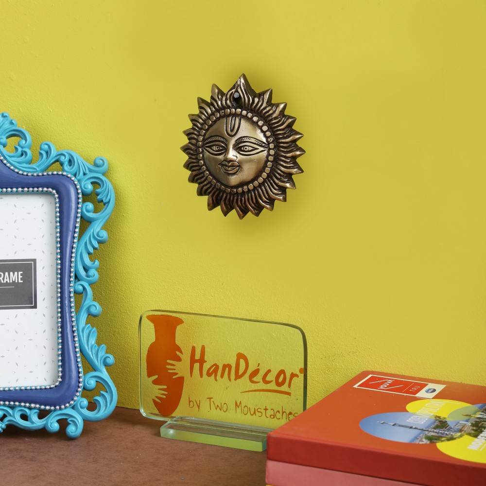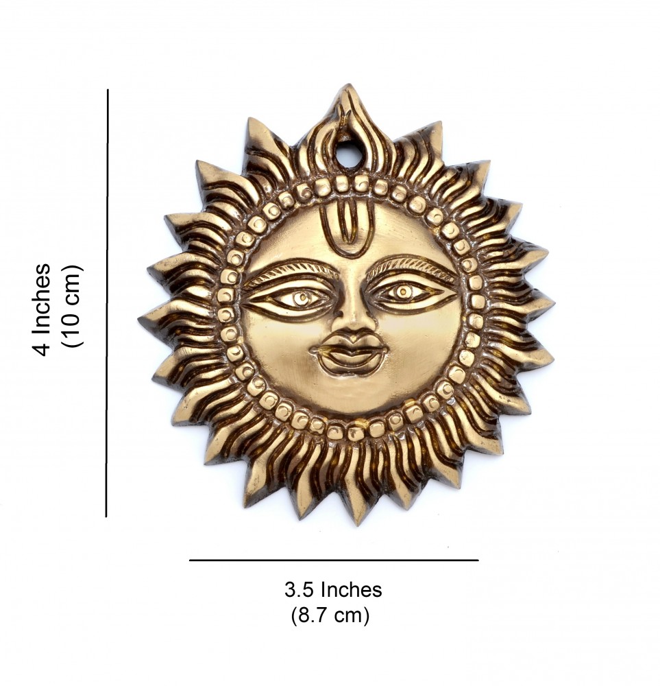Enlighten your dwelling with this unique antique decorative Surya Wall Hanging from Two Moustaches. Surya symbolizes the Sun God, the Lord considered as the only visible form of God that can be seen every day. He is regarded as the provider of power, knowledge, courage and intelligence. This flawless array of attractive piece is made from pure brass which makes it highly robust and durable with huge shine that remains vivid for years. Bring good luck for everyone in the family by placing this 3.5x4 inches Wall décor over the main door of your house.