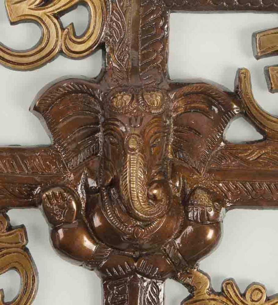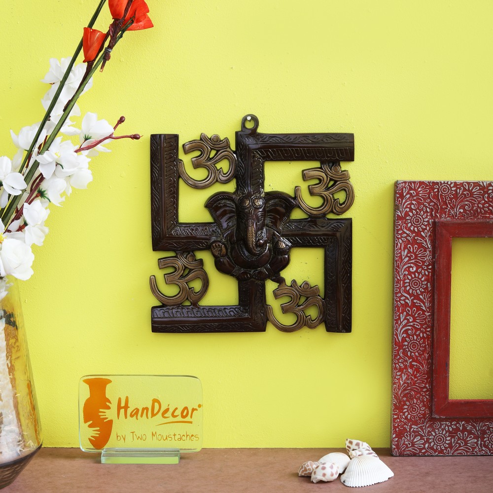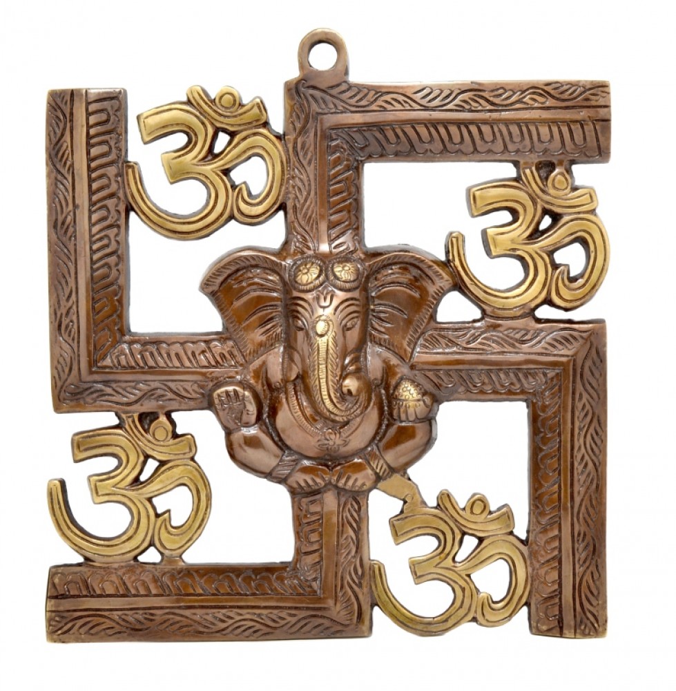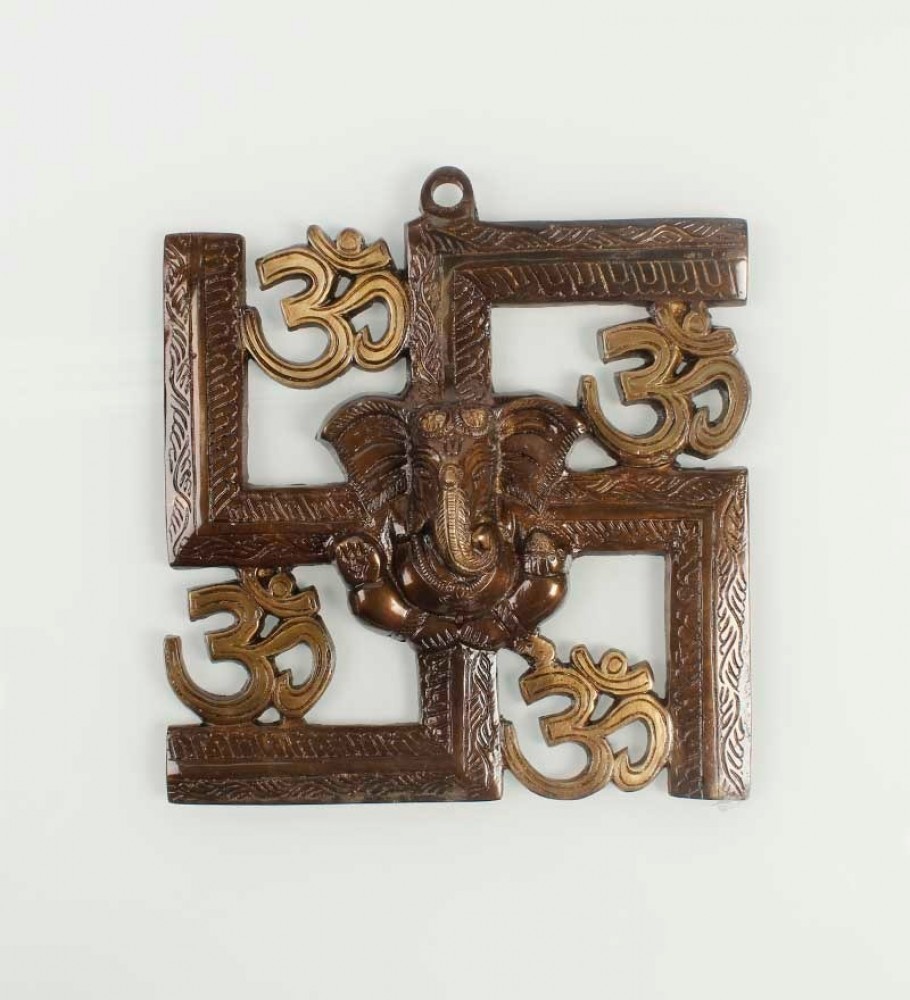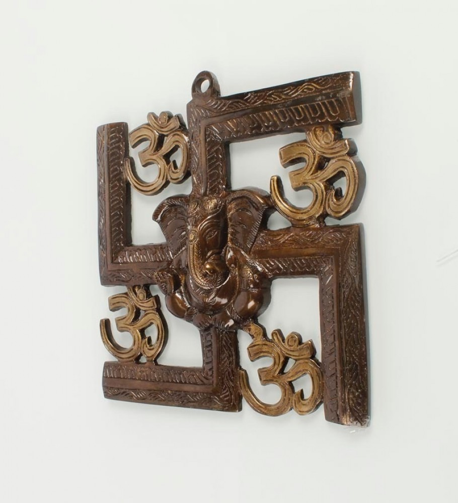 Ganesha over OM and Ganesha over Swastika Wall Hanging is a prominent religious product for gifting purposes. Om is a holy Hindu symbol as a sign of good luck and prosperity being prominently displayed at temples, home and religious ceremonies. The icon of Lord Ganesha on Om & Swastika liberates and represents cosmic energy forces. This beautiful wall hanging glorifies a divine inspiration. It is a modern show piece for your drawing room, sure to be admired by your guests. It is also an ideal gift for your friends and relatives. Lord Ganesha is worshiped in the beginning of any auspicious performance for blessings and auspiciousness.