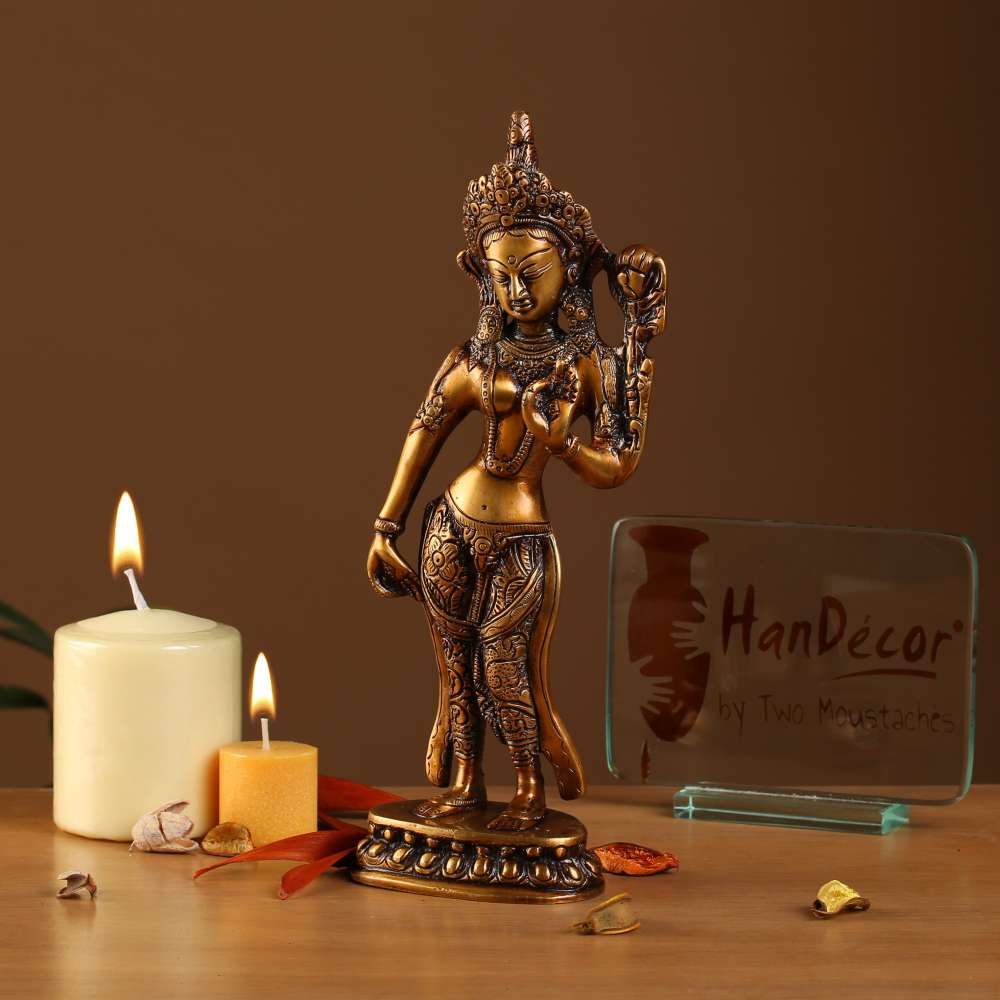 Are you looking for a Goddess showpiece? Take a look at the standing Tara showpiece from Handecor. The showpieces shows, Tara, a Buddhist savior-goddess in a standing posture on a pedestal. Tara, which means 'star' in Sanskrit, is considered to be one of the renowned Goddesses in Tibet. She symbolizes virtue, enlightenment and longevity and leads her followers towards enlightenment through a spiritual journey. The showpiece has been meticulously carved, with an eye to minute details, like the Goddess's dress, engravings on the pedestal, among others. Made of ethnic brass, the showpiece has a fascinating polished exterior. This showpiece will add a dash of creativity as well as religiousness to the interiors.