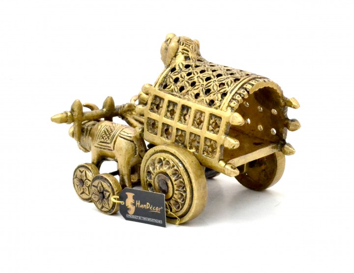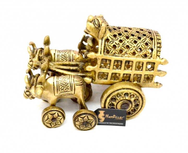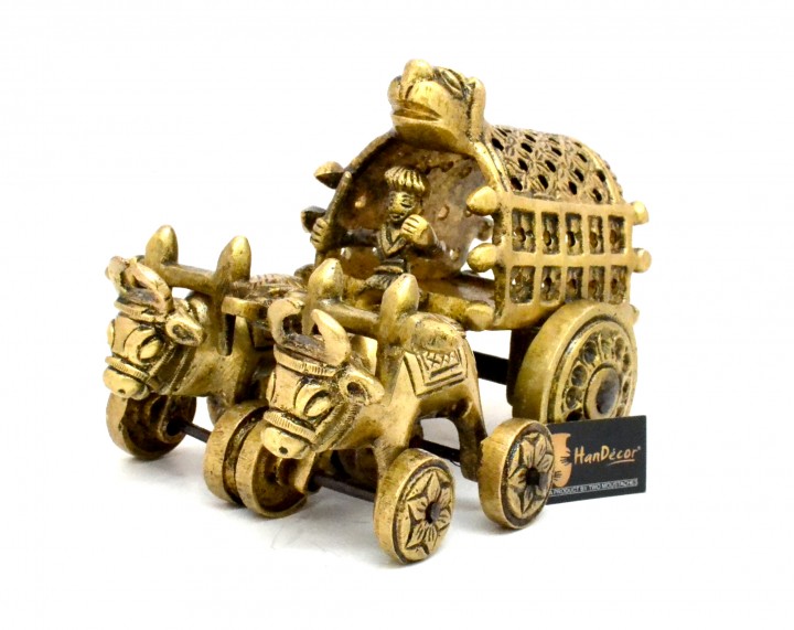 A Charming and wonderful decorative item for homes and offices. Gift this bullock cart sculpture as a wedding or anniversary gift to friends and dear ones. They will surely thank you for your unique choice. The beautiful sculpture is in golden color and is made of brass. It will definitely look great as a showpiece for sure.