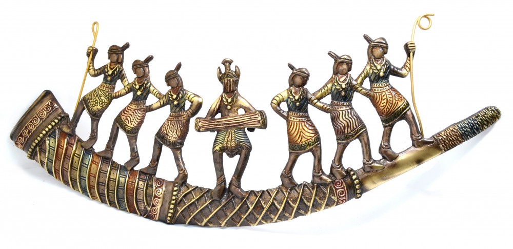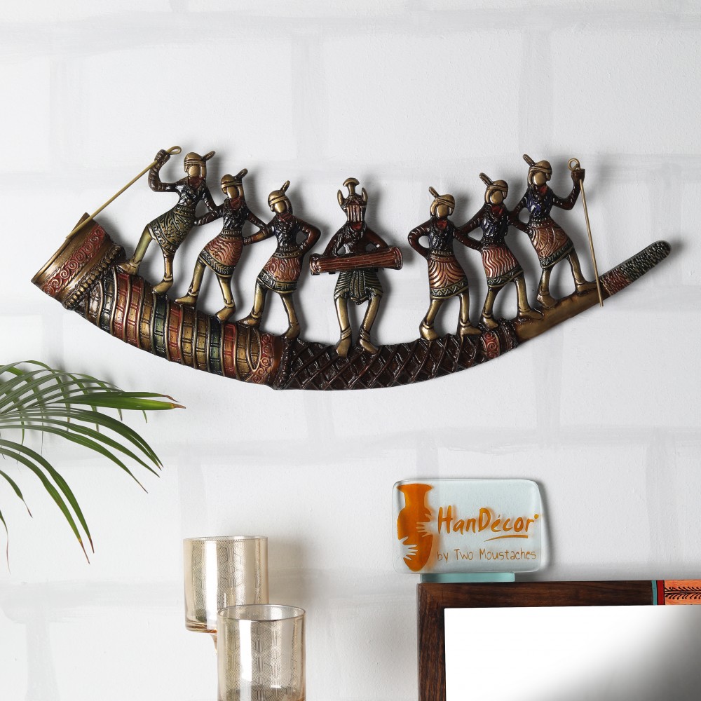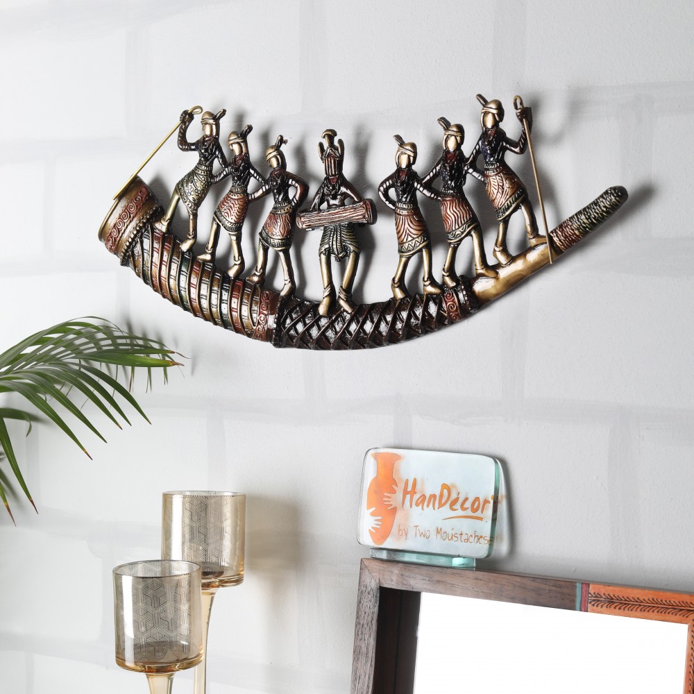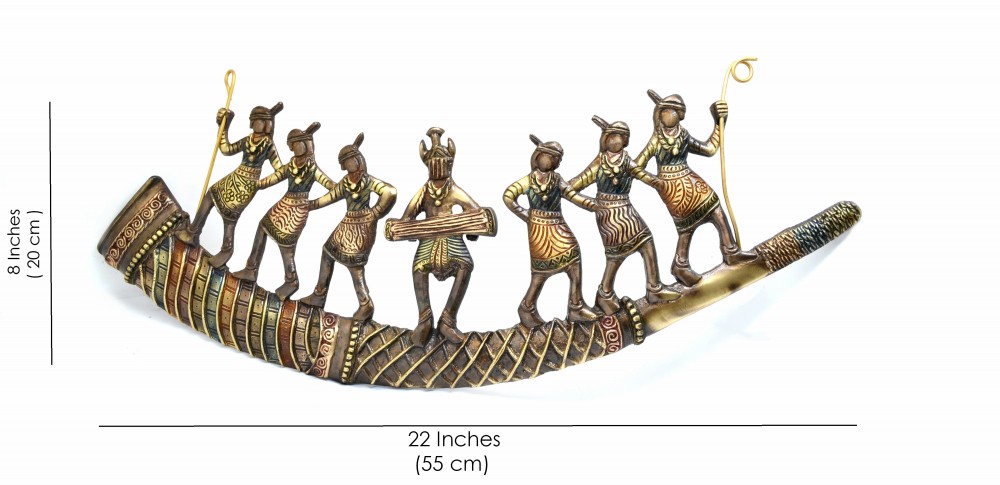 Hear the music of the mountains and the earthy call of the tribes every time you look at this gorgeous wall hanging from Two Moustaches. A beautifully engraved brass horn supports seven tribal folks engrossed in a sequence of music and dance. The beautiful detailing on the wall hanging adds to its ethnic appeal. Made from brass, this wall hanging is sturdy and easy to maintain.