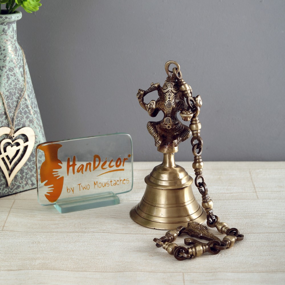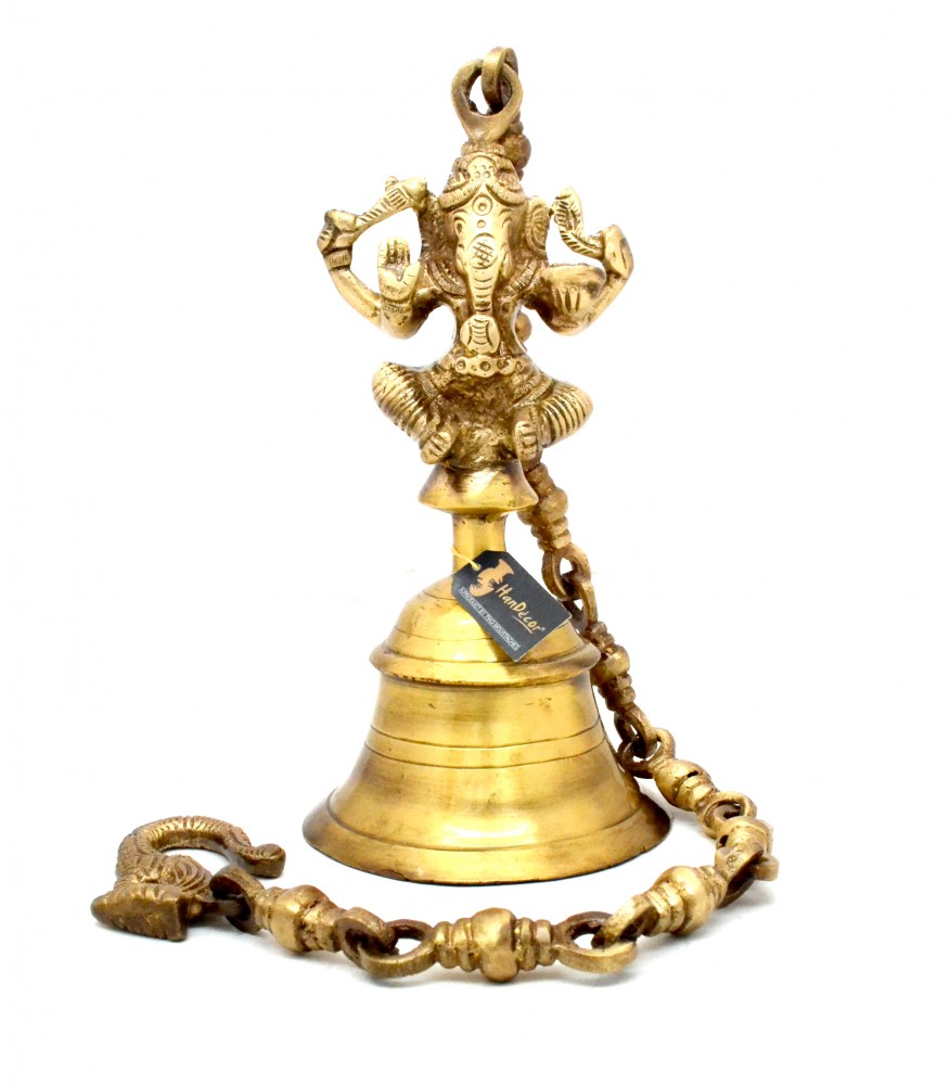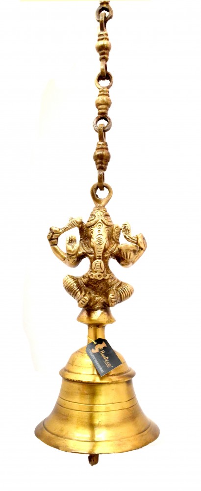 Bells used in Hindu ceremonies and temples are also called "Ghantas".This exquisite brass bell crafted by skilled artisans has our own beginner of good fortune Ganesha in aashirwaad mudra and is hand crafted out of solid brass and hangs on a brass chain with links. One can find temple bells in all sizes and heights hanging at the entrance of all temples in India and it is tradition to ring the bell while entering or exiting the temple once prayers are over as a sign of good omen. The chiming of bells are also rung to start all puja / prayer ceremonies. The ringing of the bells signifies offerings to the Gods and is supposed to be the first sound of creation, Om and as per the old saying, are also meant to to keep evil forces away.