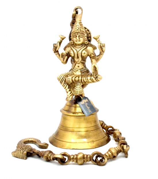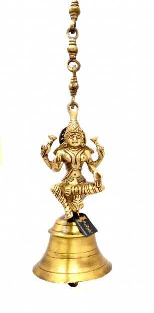 Bells used in Hindu ceremonies and temples are also called "Ghantas".This exquisite brass bell crafted by skilled artisans has our own goddess of wealth Laxmi in aashirwaad mudra and is hand crafted out of solid brass and hangs on a brass chain with links. One can find temple bells in all sizes and heights hanging at the entrance of all temples in India and it is tradition to ring the bell while entering or exiting the temple once prayers are over as a sign of good omen. The chiming of bells are also rung to start all puja / prayer ceremonies. The ringing of the bells signifies offerings to the Gods and is supposed to be the first sound of creation, Om and as per the old saying, are also meant to to keep evil forces away.